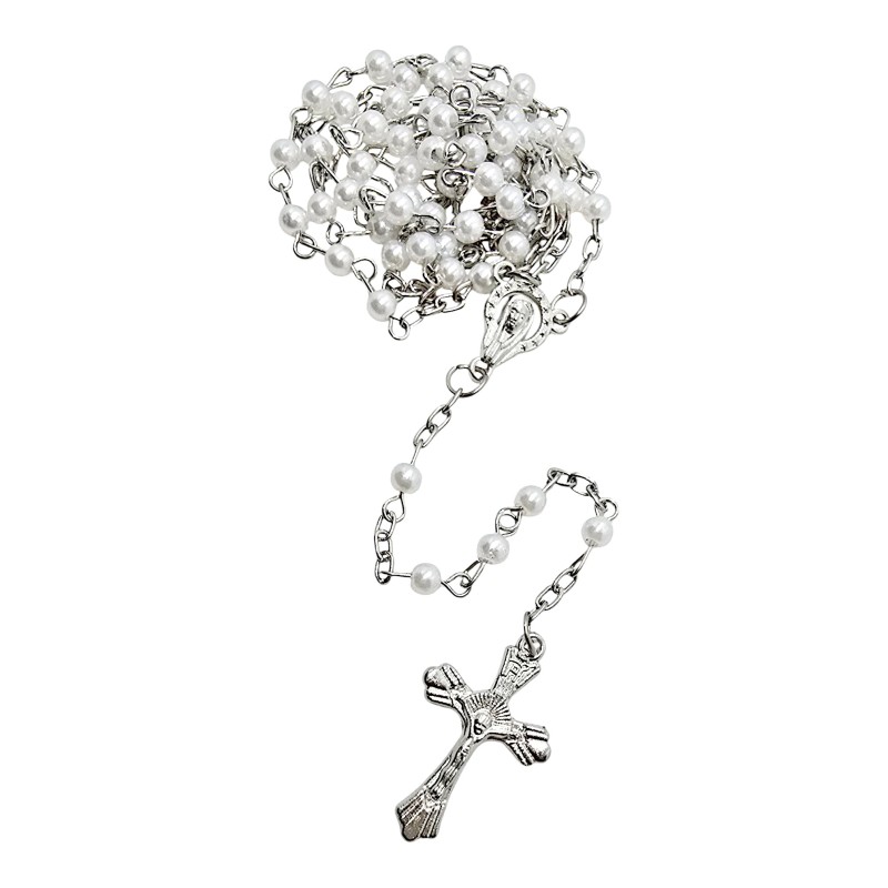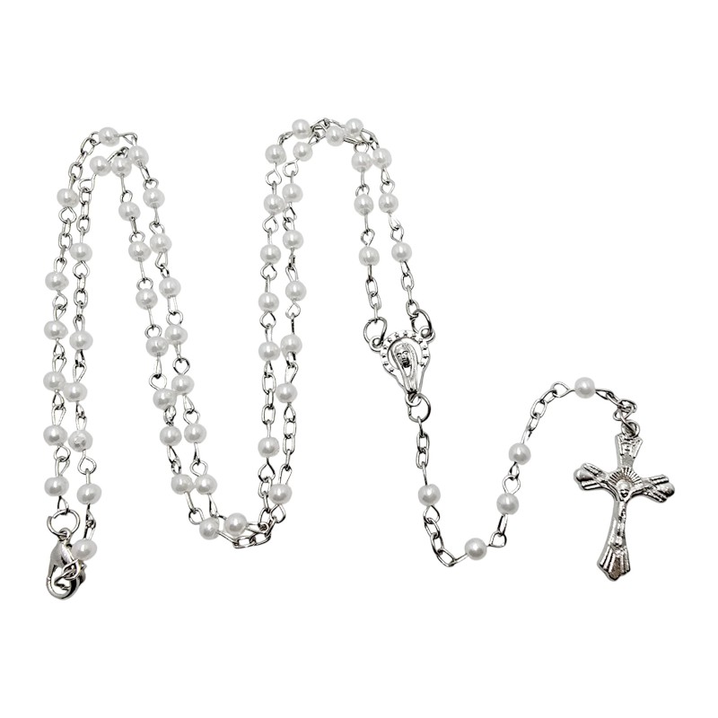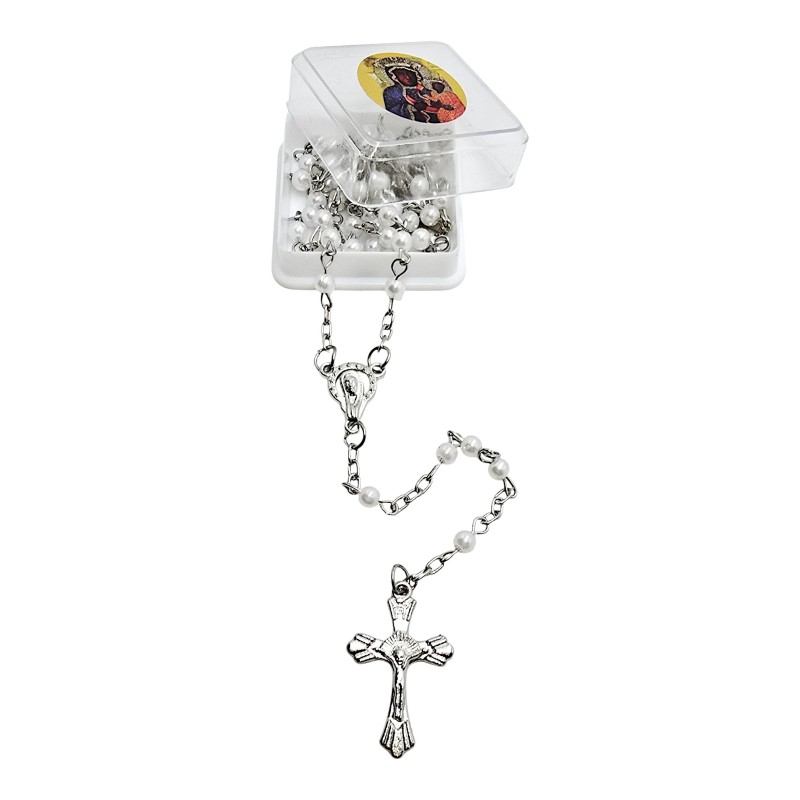 Elegancki i delikatny różaniec zapinany, idealny do noszenia na szyi jako łańcuszek lub do zawieszenia np. w aucie. Różaniec wykonany jest z malutkich, plastikowych kuleczek o średnicy 4 mm, które mienią się pięknym białym, perłowym kolorem. Koraliki są nawleczone na wytrzymały łańcuszek i całość jest zapinana. Różaniec jest pakowany w estetyczne plastikowe pudełeczko (38x38 mm), dzięki czemu idealnie nadaje się na prezent.