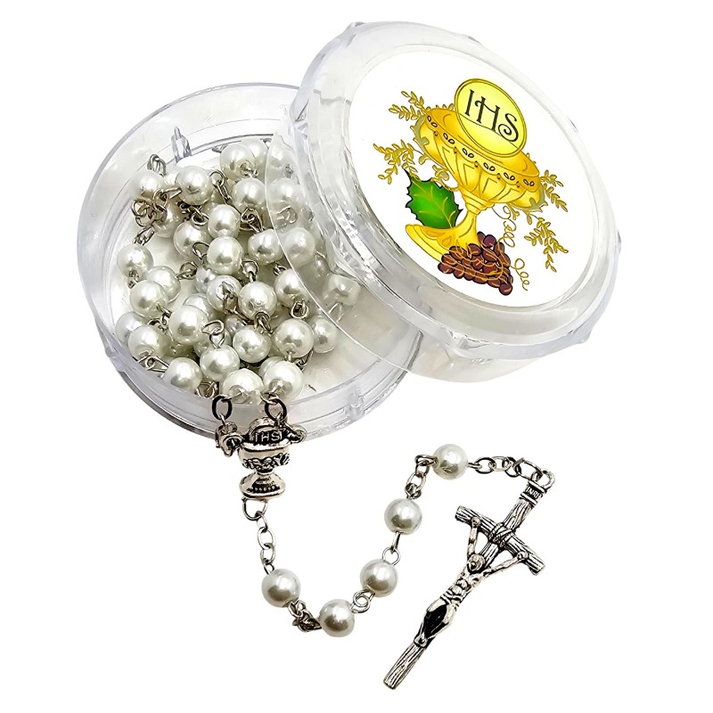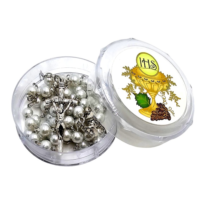 Różaniec Komunijny w Ozdobnym Pudełeczku - Biały Perłowy.