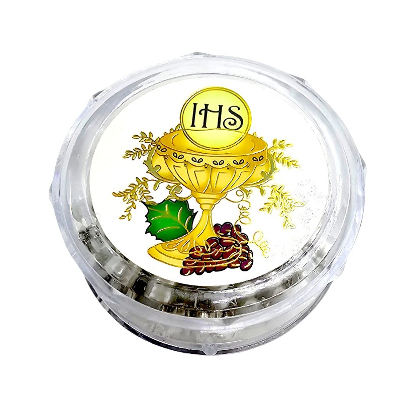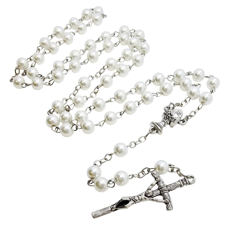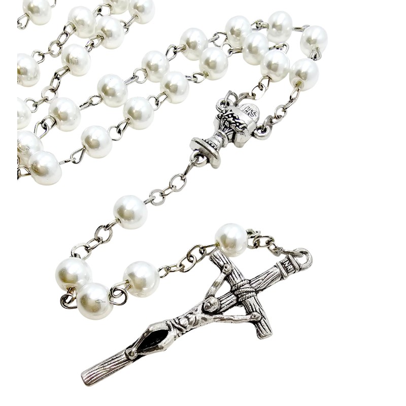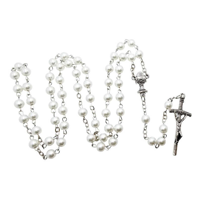 Wyjątkowy różaniec komunijny, idealny na pamiątkę Pierwszej Komunii Świętej. Wykonany z pięknych, białych koralików o perłowym połysku i średnicy 6 mm. Centralnym elementem różańca jest łącznik w kształcie kielicha z Hostią, symbolizujący Eucharystię. Całość zwieńczona jest eleganckim krzyżem papieskim o wymiarach 44x18 mm. Długość różańca wynosi 48 cm. Różaniec zapakowany jest w piękne, ozdobne pudełeczko, co czyni go gotowym i wyjątkowym prezentem na to ważne wydarzenie.