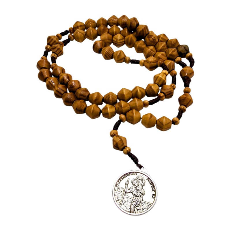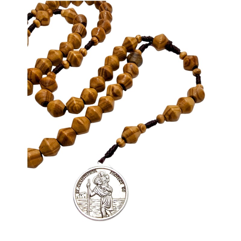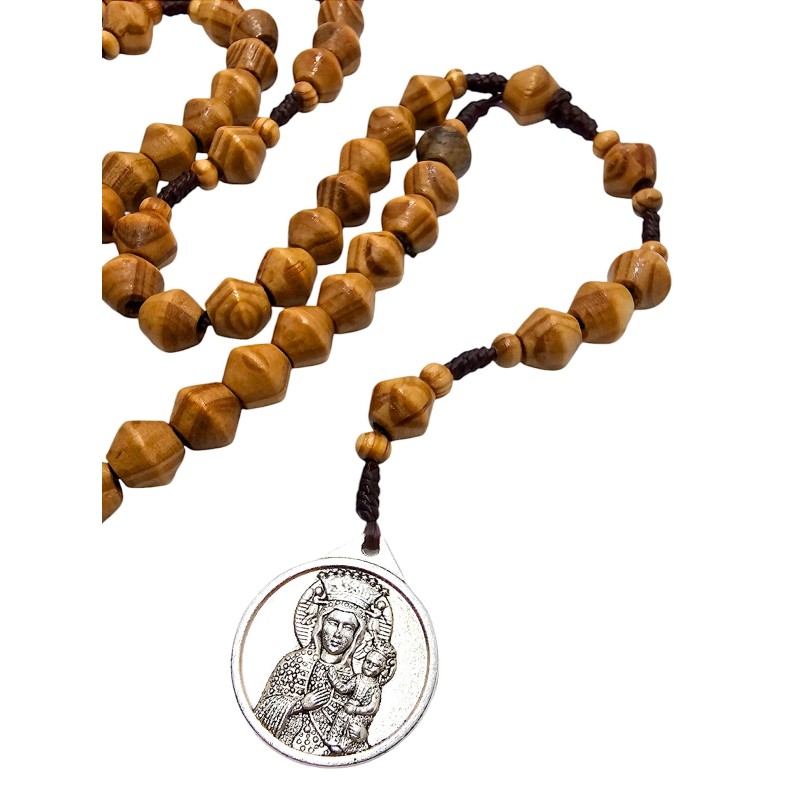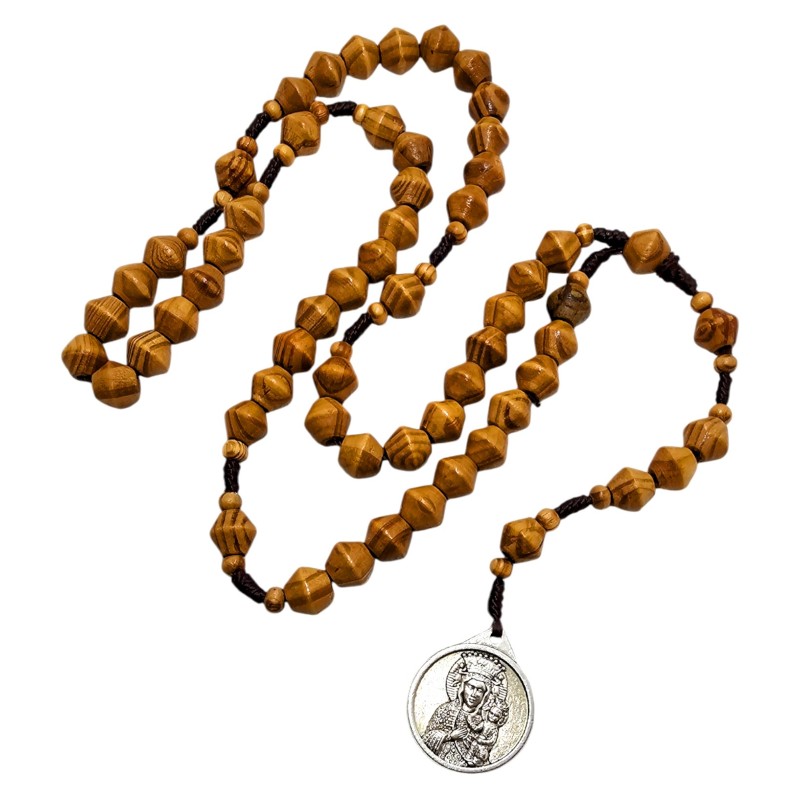 Różaniec składa się z drewnianych koralików o stożkowym kształcie, które zostały wykonane z autentycznego drzewa oliwnego. Koraliki mają około 1 cm i idealnie układają się w dłoni podczas modlitwy. Całość nawleczono na wytrzymały sznurek, co zapewnia trwałość i komfort użytkowania.