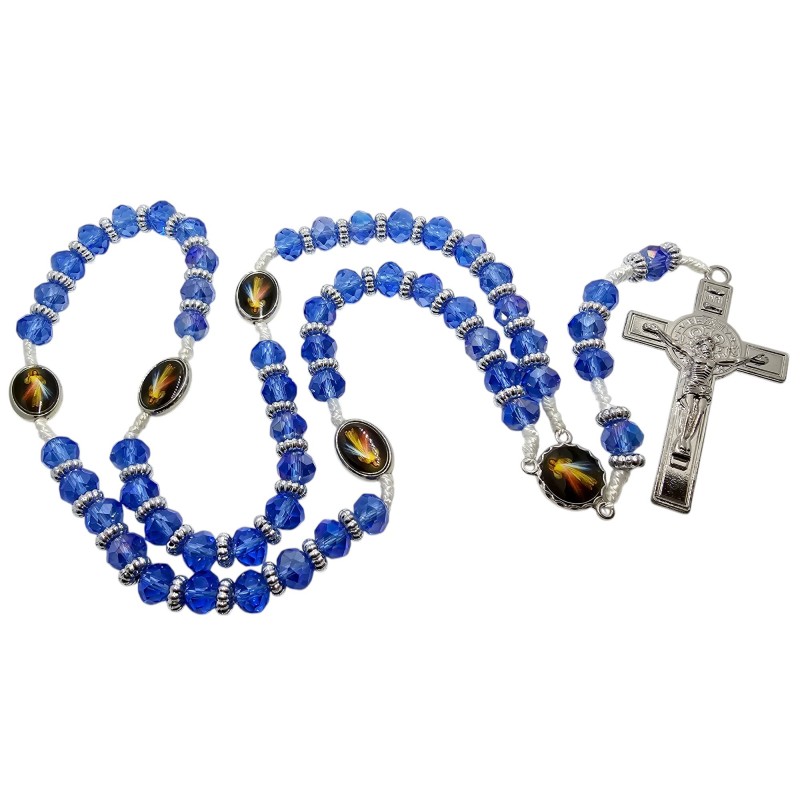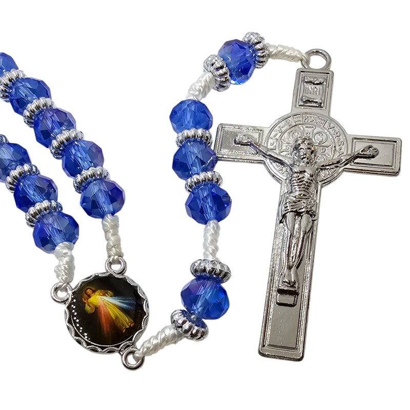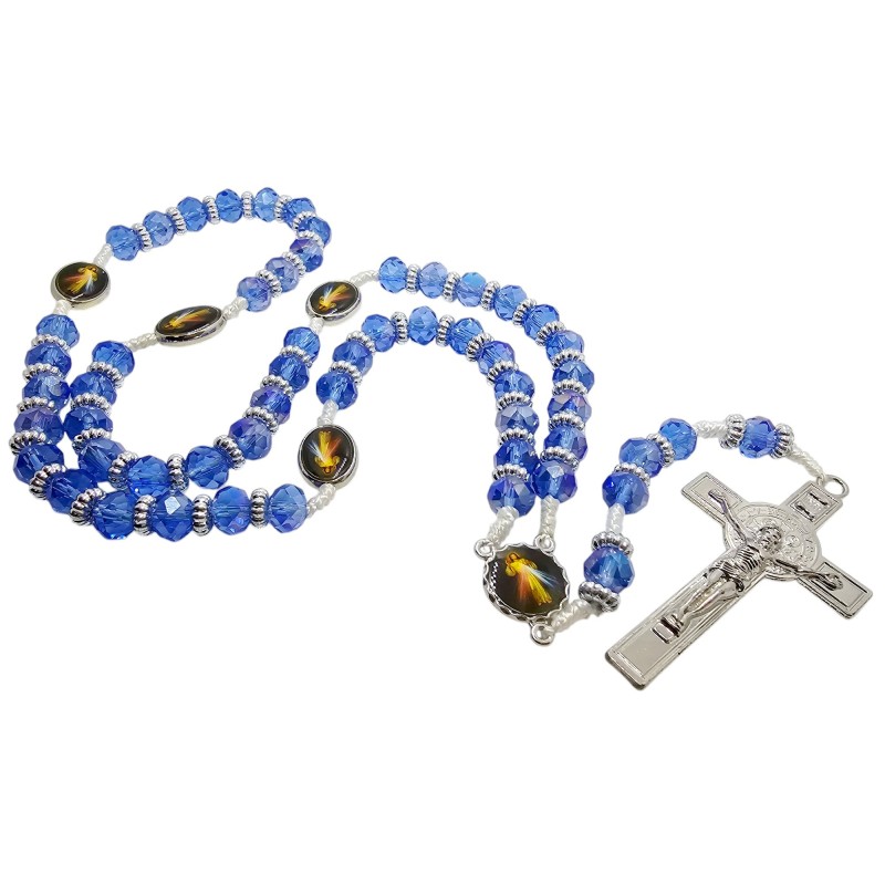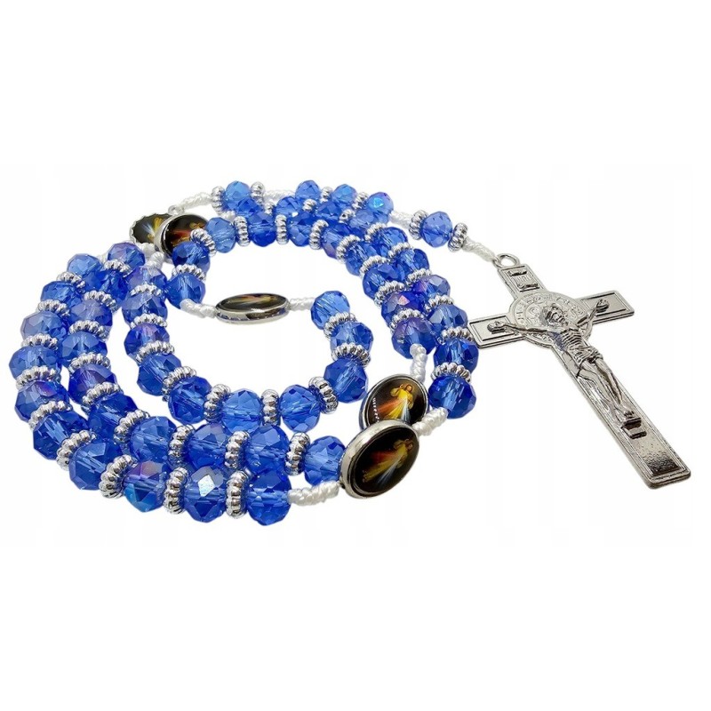 Odkryj piękno i głębię modlitwy z naszym wyjątkowym, niebieskim kryształowym różańcem. Wykonany z efektownych, szklanych koralików o wielkości 10 mm, które wspaniale odbijają światło. Każda dziesiątka różańca oddzielona jest metalowym medalikiem z wizerunkiem Jezusa Miłosiernego z obrazu św. Faustyny Kowalskiej "Jezu Ufam Tobie". Dodatkowo, każdy kryształowy koralik jest ozdobiony i oddzielony od siebie drobnym, srebrnym elementem z plastiku, co nadaje mu unikalny charakter. Różaniec o długości 52 cm zwieńczony jest metalowym krzyżem o wymiarach 68x40 mm. Całość wykonana jest na trwałym sznurku. To elegancki i pełen duchowego znaczenia różaniec, idealny do codziennej modlitwy i jako wyjątkowy prezent.