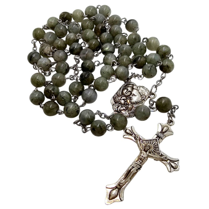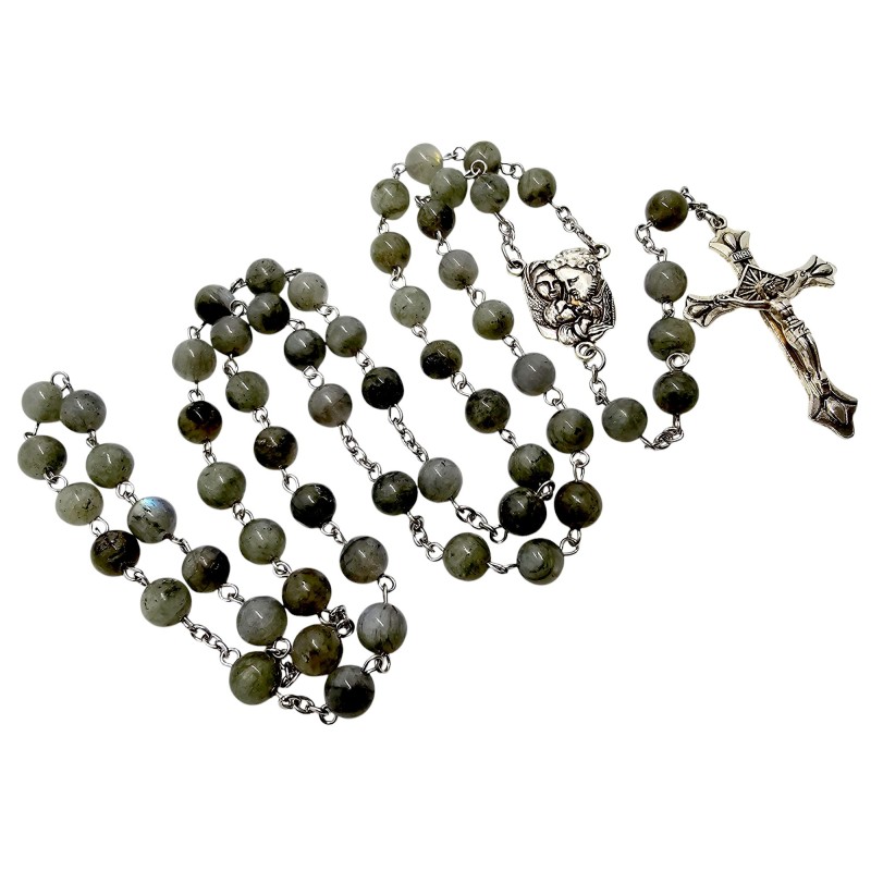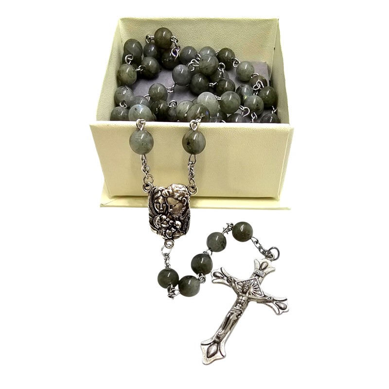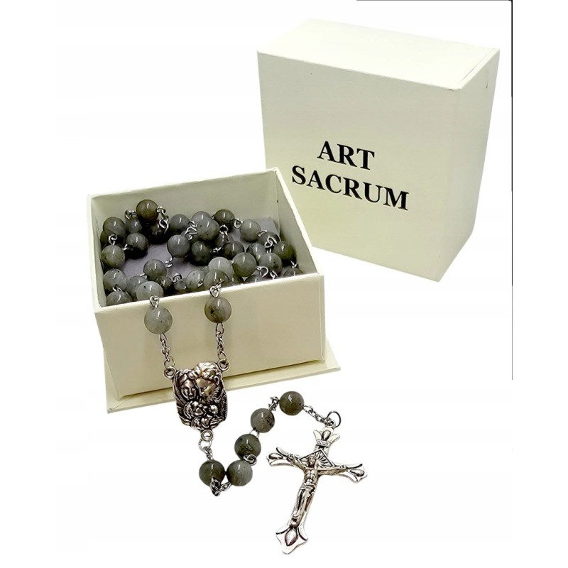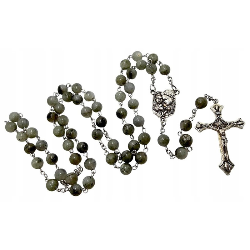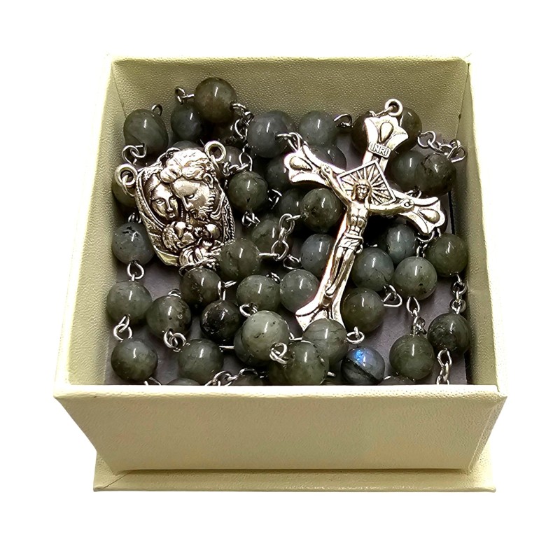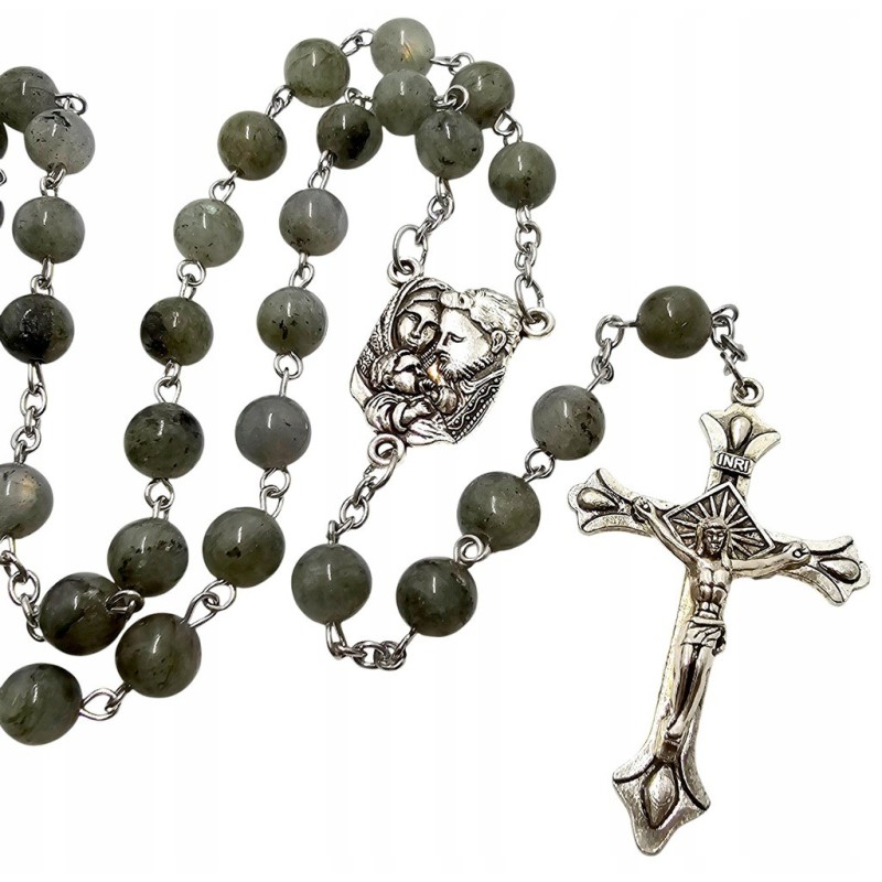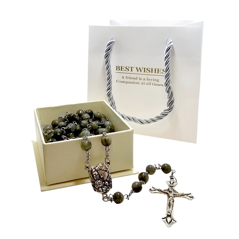 Elegancki Różaniec z Labradorytu - Święta Rodzina, Pudełko i Torba Prezentowa.