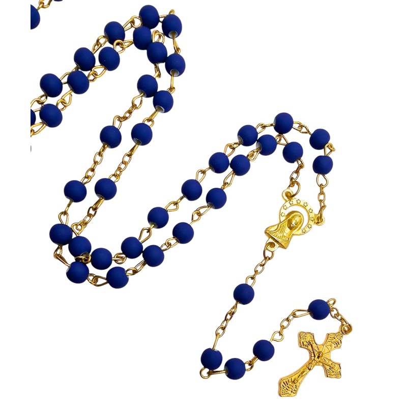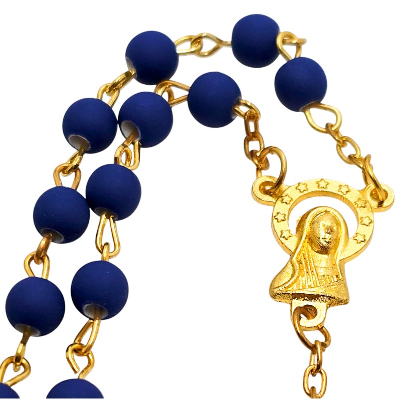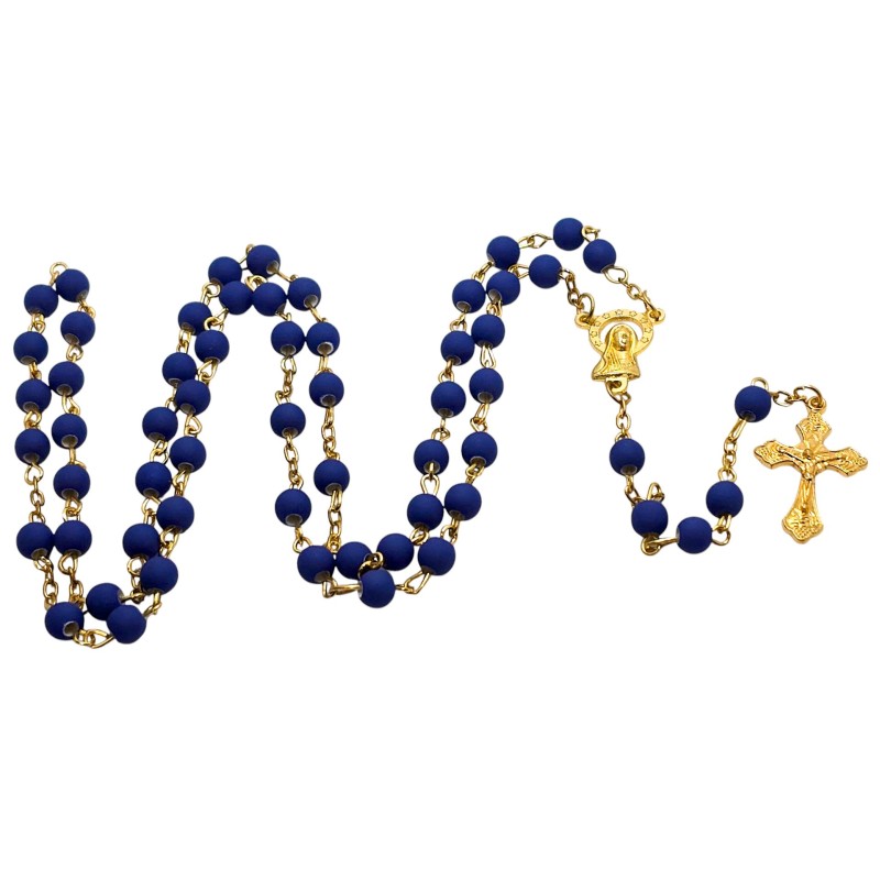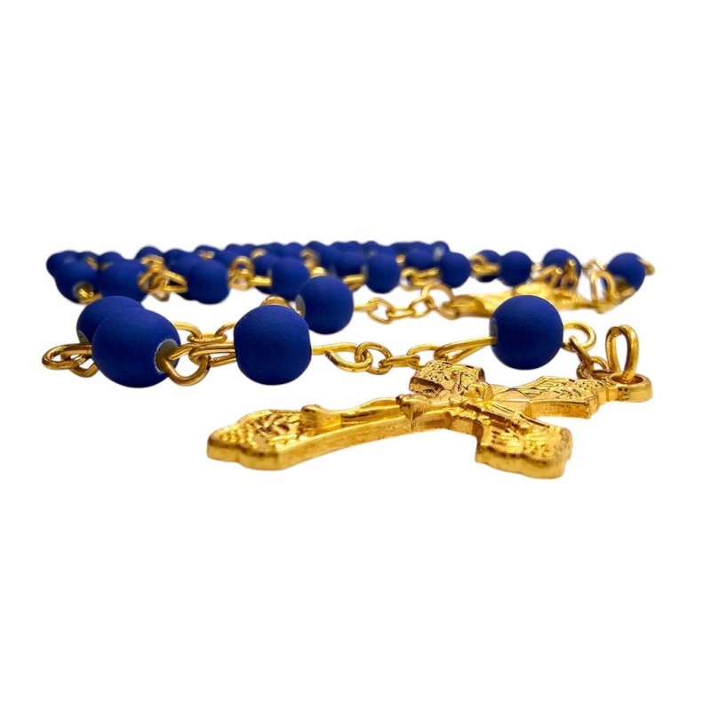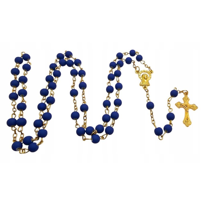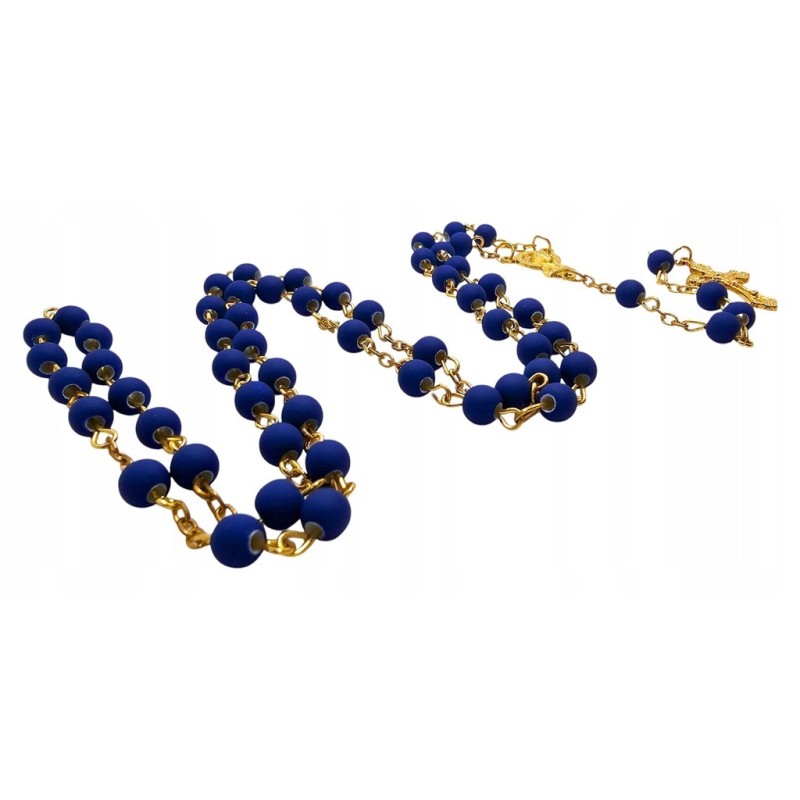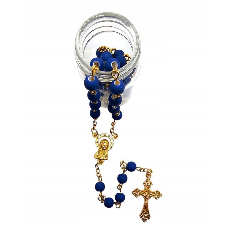 Odkryj wyjątkowe połączenie piękna i elegancji w naszym niebieskim różańcu, umieszczonym w stylowym słoiczku ze złotym wieczkiem. Całość prezentuje się niezwykle wytwornie i stanowi idealny pomysł na luksusowy prezent. Różaniec wykonany jest z matowych, niebieskich koralików o wielkości 6 mm, które cudownie współgrają z delikatnym, złotym łańcuszkiem. Łącznikiem różańca jest wizerunek Maryi, a całość wieńczy piękny krzyż o wymiarach 28x18 mm. Długość różańca wynosi 49 cm. Słoiczek o wysokości 5 cm dodaje całości ekskluzywnego charakteru.
