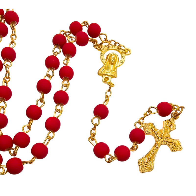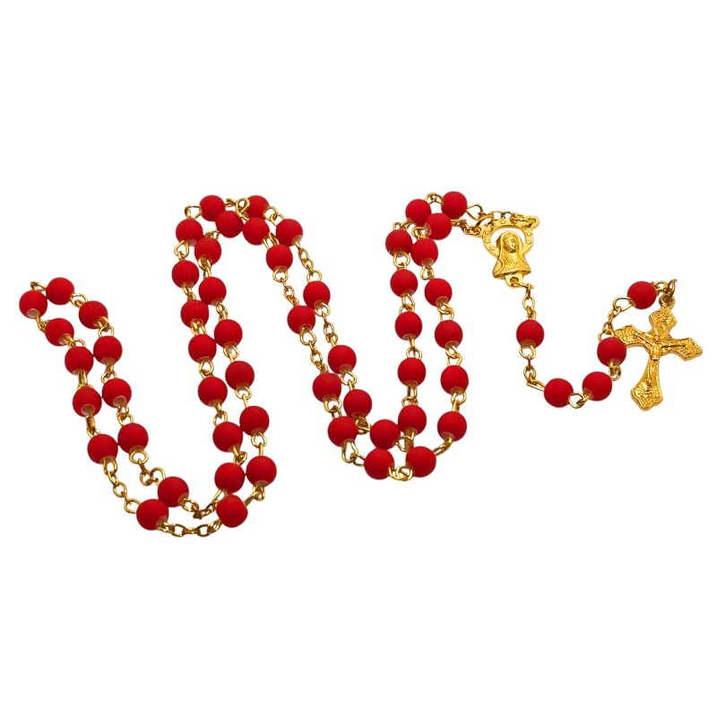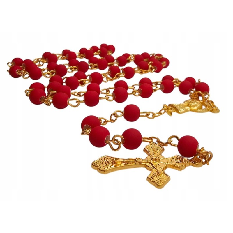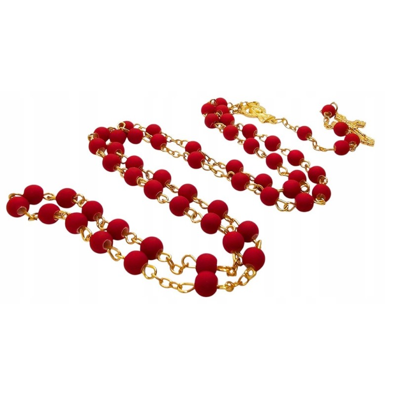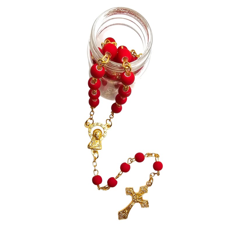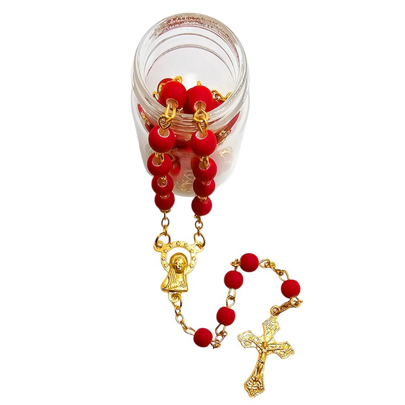 Odkryj wyjątkowe połączenie piękna i elegancji w naszym czerwonym różańcu, umieszczonym w stylowym słoiczku ze złotym wieczkiem. Całość prezentuje się niezwykle wytwornie i stanowi idealny pomysł na luksusowy prezent. Różaniec wykonany jest z matowych, czerwonych koralików o wielkości 6 mm, które cudownie współgrają z delikatnym, złotym łańcuszkiem. Łącznikiem różańca jest wizerunek Maryi, a całość wieńczy piękny krzyż o wymiarach 28x18 mm. Długość różańca wynosi 49 cm. Słoiczek o wysokości 5 cm dodaje całości ekskluzywnego charakteru.