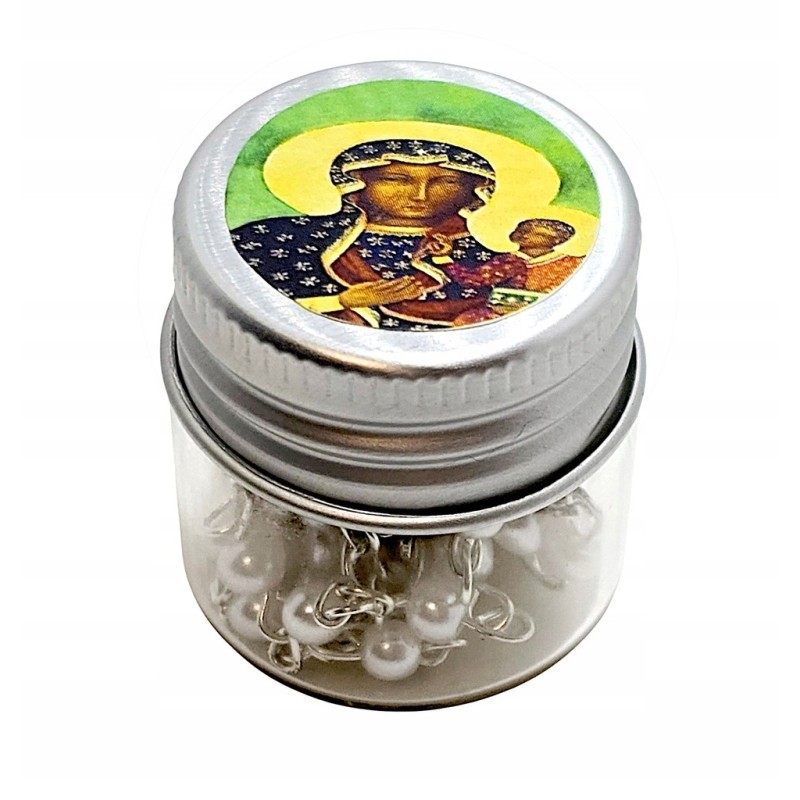 Odkryj wyjątkowy i praktyczny różaniec umieszczony w małym, zakręcanym słoiczku. Na wieczku słoiczka znajduje się obraz Matki Boskiej Częstochowskiej, dodający mu duchowego charakteru. Różaniec wykonany jest z drobnych, plastikowych koralików o perłowym połysku w rozmiarze 4 mm. Zwieńczony jest krzyżykiem o wymiarach 17x23 mm. Dzięki zapięciu i długości 42 cm, różaniec idealnie nadaje się do zawieszenia w samochodzie. Słoiczek o wysokości 3 cm chroni różaniec i sprawia, że jest to wyjątkowy drobiazg, idealny jako prezent lub osobista pamiątka.