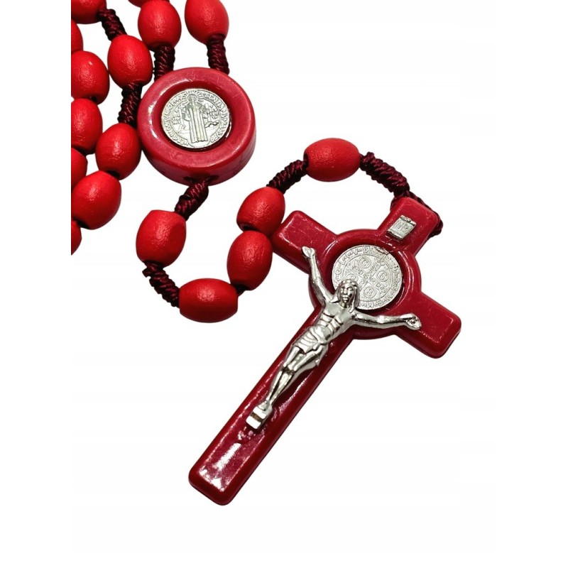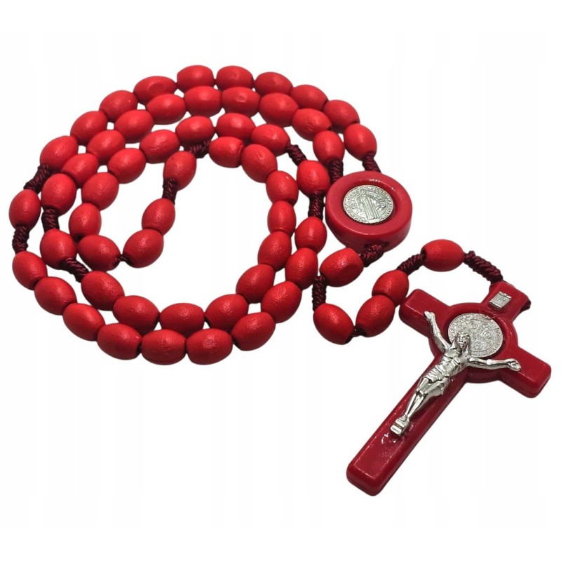 Czerwony Różaniec z Medalikiem św. Benedykta - Drewniane Koraliki, Symbol Ochrony