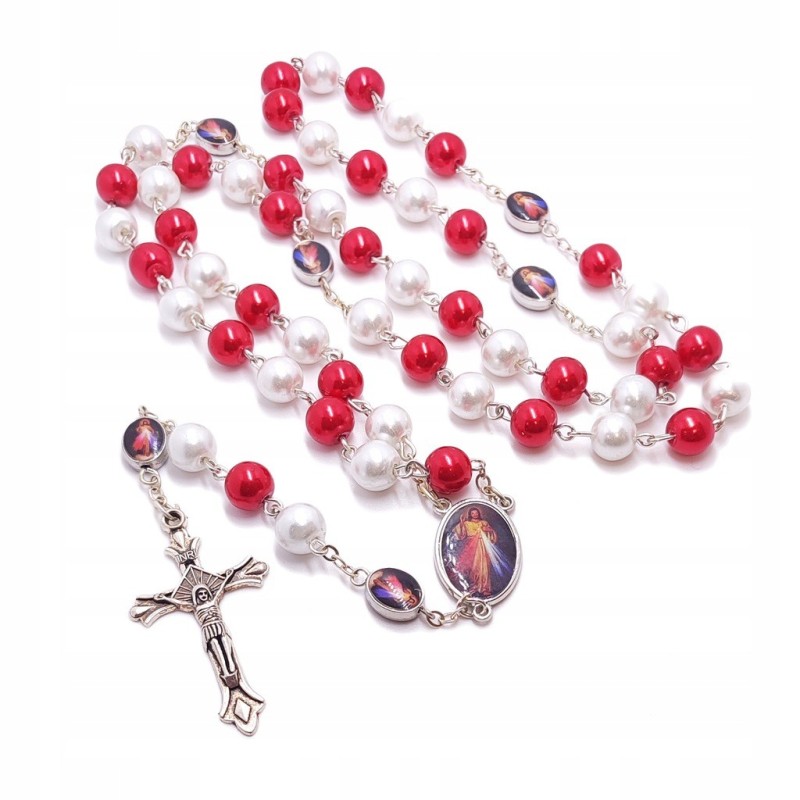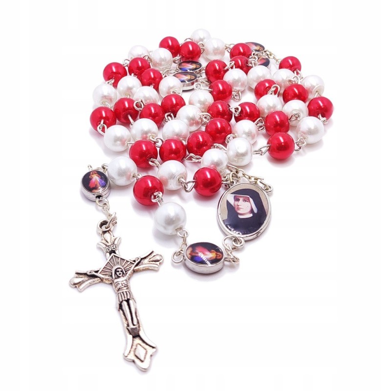 Różaniec Jezu Ufam Tobie - Czerwono-Biały Różaniec z wizerunkiem Jezusa Miłosiernego i św. Faustyny.