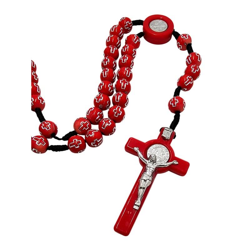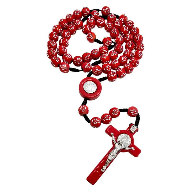 Różaniec został wykonany z trwałych, czerwonych, plastikowych koralików o wielkości 10 mm, które są przyjemne w dotyku. Każdy koralik zdobią wygrawerowane krzyże wypełnione srebrnym kolorem, co nadaje całości eleganckiego charakteru. Łącznikiem jest medalik Świętego Benedykta, a całość wieńczy duży krzyż Świętego Benedykta o imponujących wymiarach 36x63 mm.