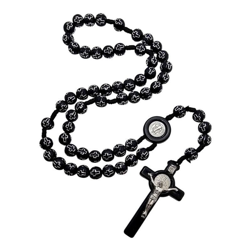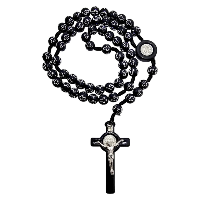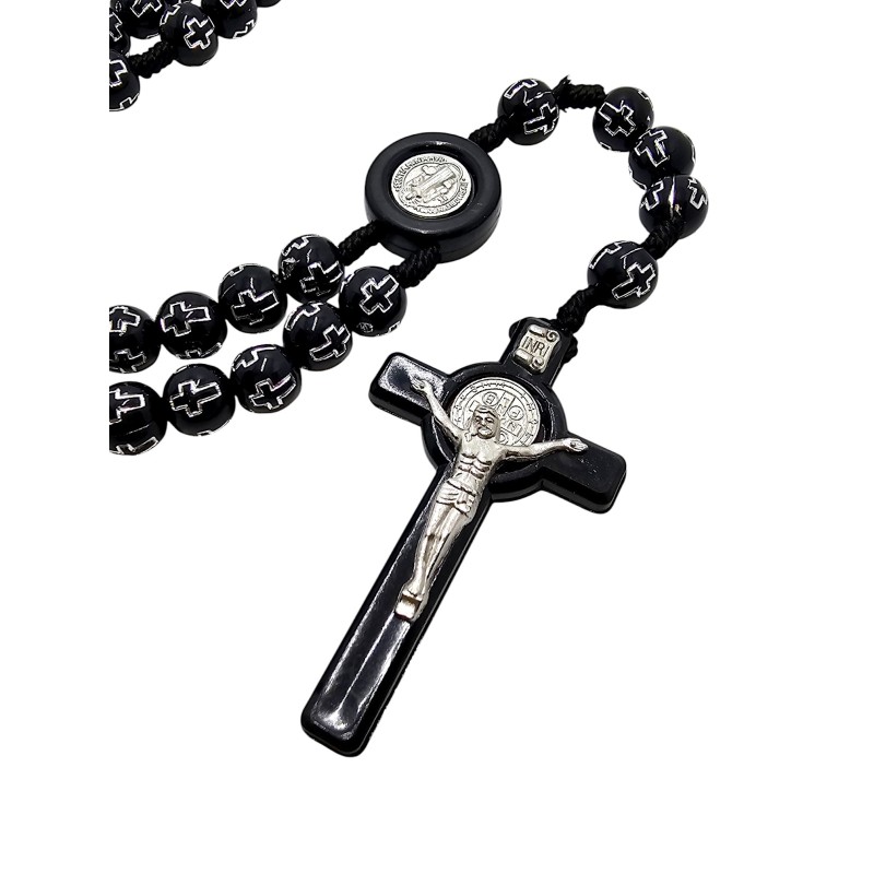 Różaniec został wykonany z trwałych, czarnych, plastikowych koralików o wielkości 10 mm, które są przyjemne w dotyku. Każdy koralik zdobią wygrawerowane krzyże wypełnione srebrnym kolorem, co nadaje całości eleganckiego charakteru. Łącznikiem jest medalik Świętego Benedykta, a całość wieńczy duży krzyż Świętego Benedykta o imponujących wymiarach 36x63 mm.