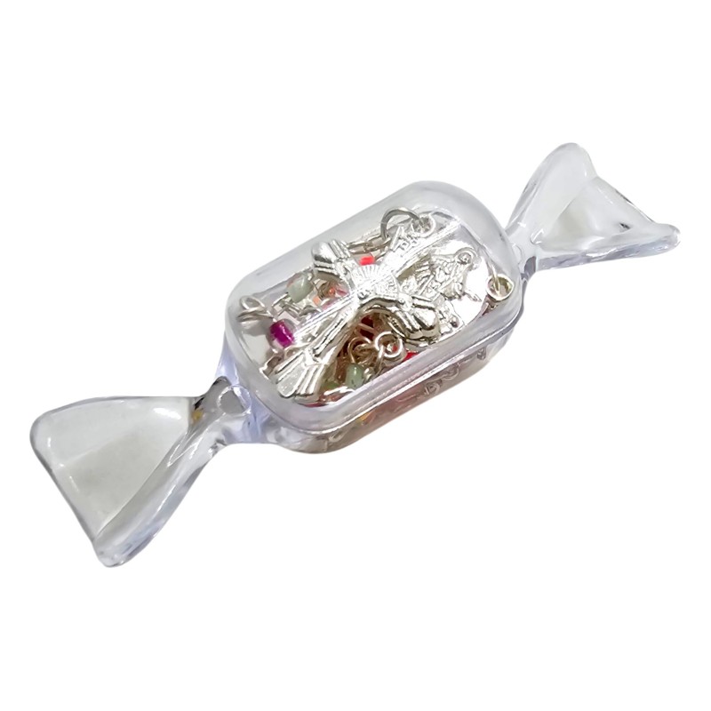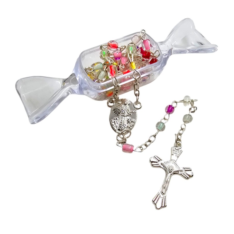 Różaniec jest zapinany, co pozwala nosić go na szyi lub zawiesić w aucie. Dzięki długości 42 cm (obwód 60 cm) jest wygodny w użytkowaniu. Całość zapakowana jest w przeźroczyste, plastikowe pudełko w kształcie cukierka, co sprawia, że jest gotowy, by stać się symbolicznym prezentem.