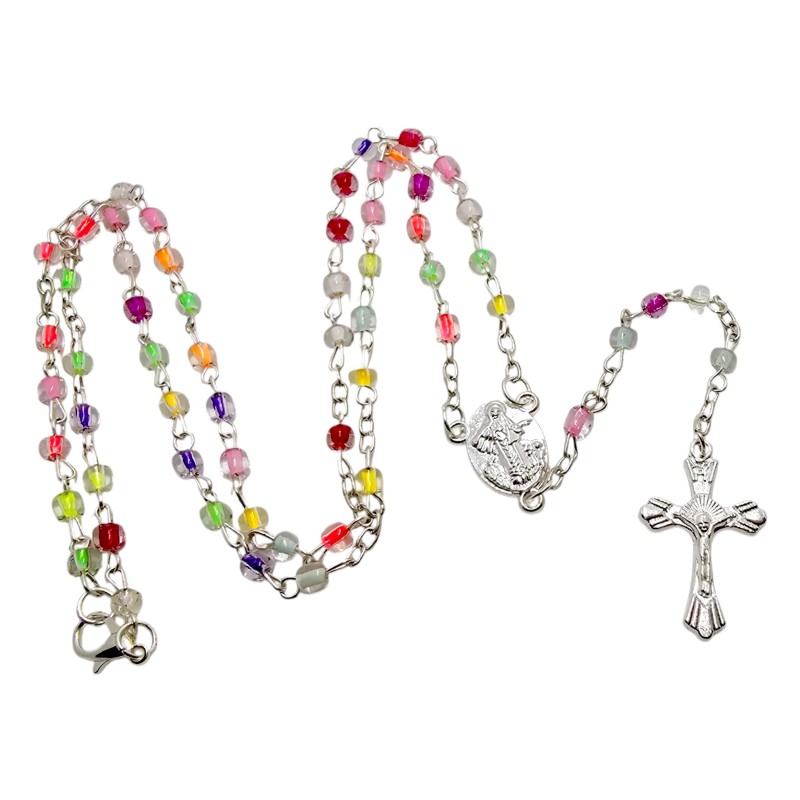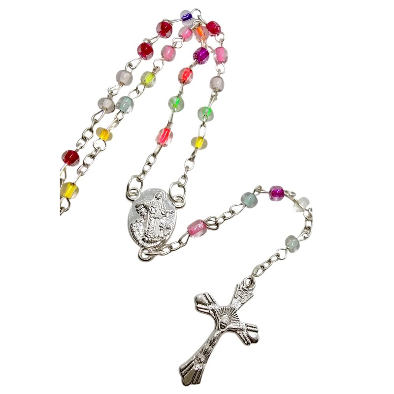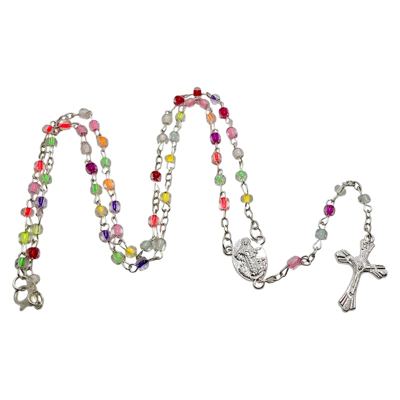 Różaniec został wykonany z małych, plastikowych koralików o wielkości 4 mm, które łączą w sobie transparentność z żywymi kolorami. To wyjątkowe połączenie nadaje mu subtelności i sprawia, że wygląda wyjątkowo pięknie. Całość wieńczy ozdobny, metalowy krzyżyk o wymiarach 17x27 mm. Łącznik różańca przedstawia z jednej strony wizerunek Matki Bożej z Medugorje, a na rewersie kościół z Medugorje.