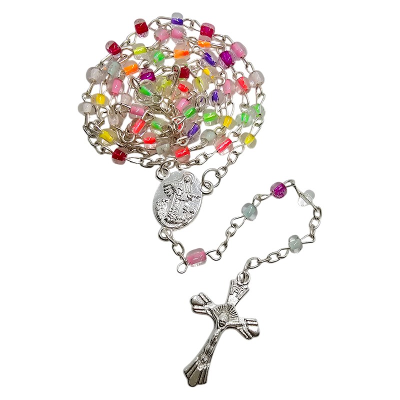 Materiał: Plastikowe koraliki, metalowy łańcuszek i krzyż