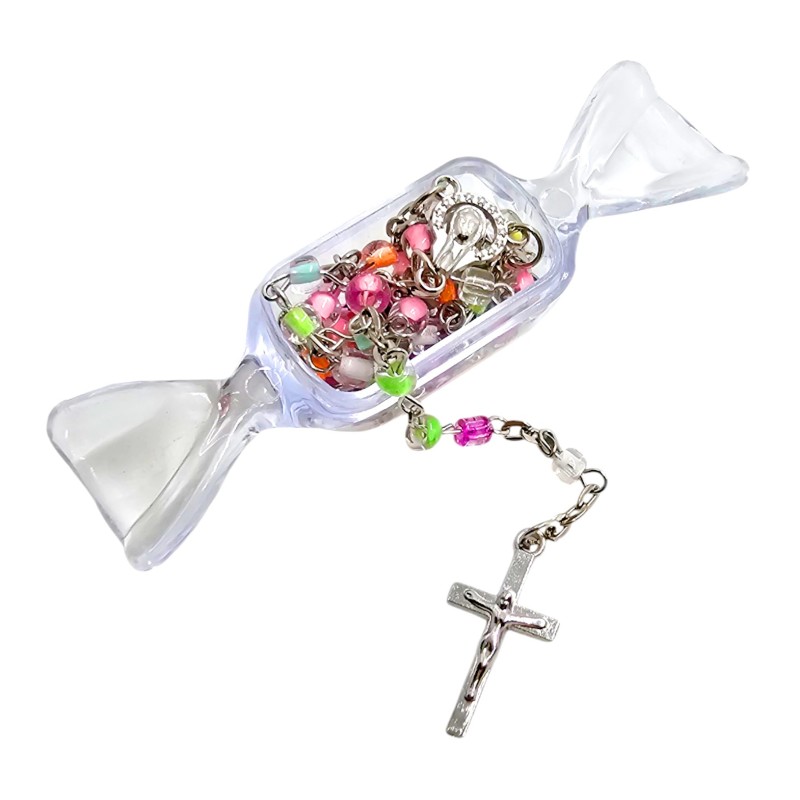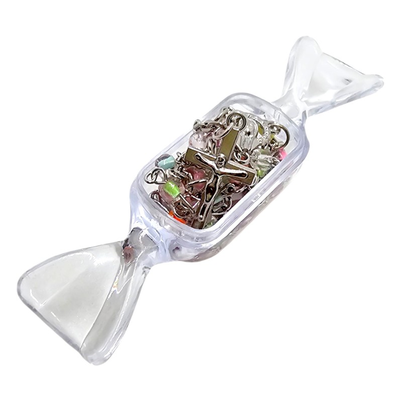 Różaniec jest zapinany, co pozwala nosić go na szyi lub zawiesić w aucie. Dzięki długości 42 cm (obwód 60 cm) jest wygodny w użytkowaniu. Całość zapakowana jest w przeźroczyste, plastikowe pudełko w kształcie cukierka, co sprawia, że jest gotowy, by stać się symbolicznym prezentem.