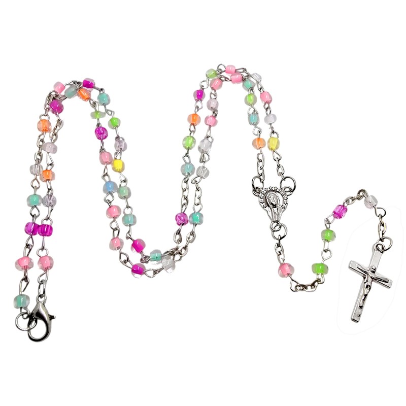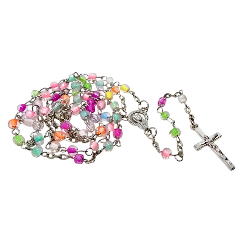 Różaniec został wykonany z małych, plastikowych koralików o wielkości 4 mm, które łączą w sobie transparentność z delikatnymi, pastelowymi kolorami. To wyjątkowe połączenie nadaje mu subtelności i sprawia, że wygląda wyjątkowo pięknie. Całość wieńczy prosty, metalowy krzyżyk o wymiarach 13x24 mm. Łącznik różańca przedstawia wizerunek Matki Bożej, która przypomina o Jej opiece i wstawiennictwie.