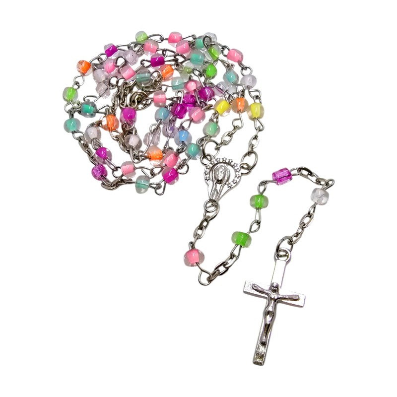 Materiał: Plastikowe koraliki, metalowy łańcuszek i krzyż