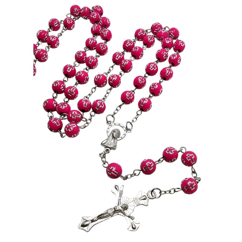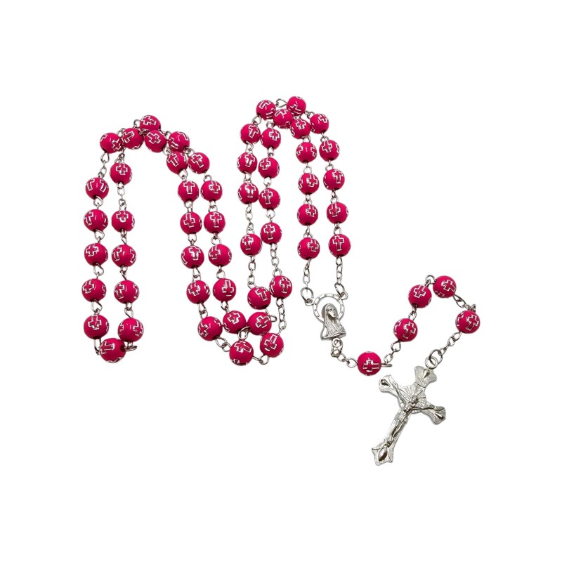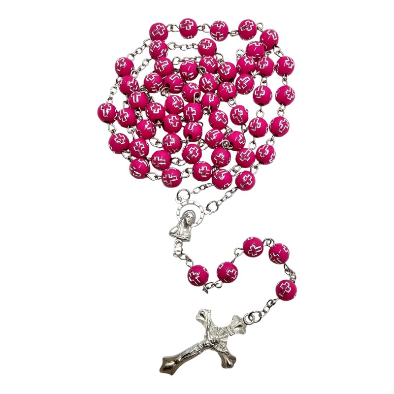 Koraliki o średnicy 8 mm zostały wykonane z wytrzymałego plastiku. Każdy z nich ozdobiono wytłoczonymi krzyżykami, wypełnionymi srebrnym kolorem, co nadaje całości eleganckiego i minimalistycznego charakteru. Połączenie koloru różowego i srebra tworzy efektowny kontrast, a faktura koralików sprawia, że są przyjemne w dotyku.