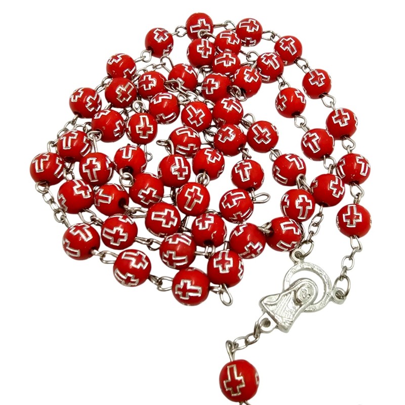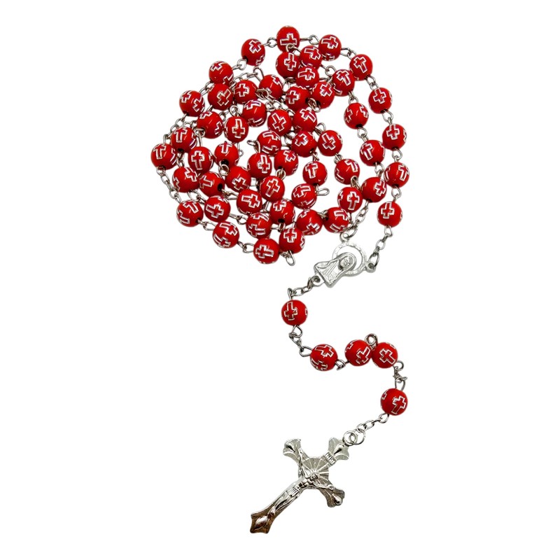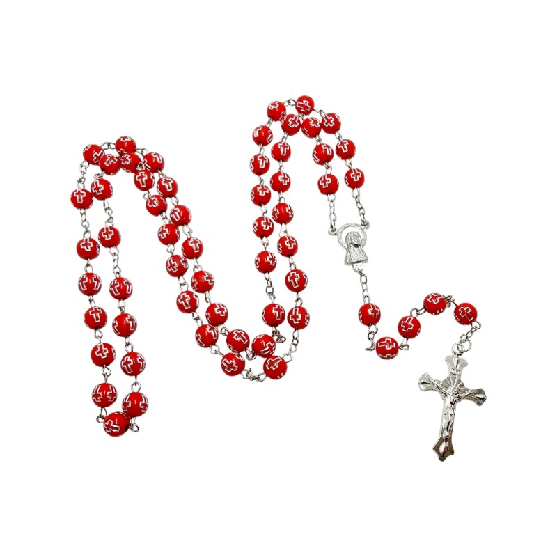 Koraliki o średnicy 8 mm zostały wykonane z wytrzymałego plastiku. Każdy z nich ozdobiono wytłoczonymi krzyżykami, wypełnionymi srebrnym kolorem, co nadaje całości eleganckiego i minimalistycznego charakteru. Połączenie koloru czerwonego i srebra tworzy efektowny kontrast, a faktura koralików sprawia, że są przyjemne w dotyku.