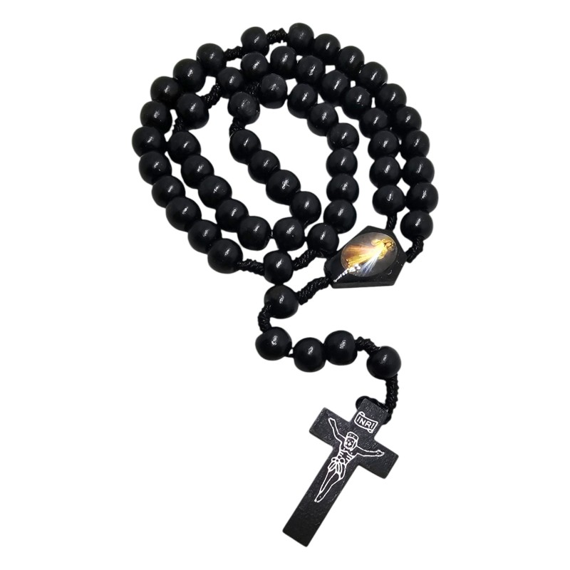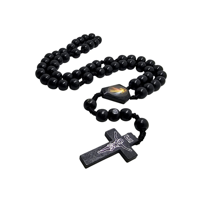 Różaniec ma długość 42 cm i obwód 54 cm, co czyni go wygodnym w użyciu i poręcznym. Składa się z gładkich, drewnianych koralików o wielkości 1 cm, które zostały pomalowane na głęboki, klasyczny czarny kolor. Ten odcień nadaje różańcowi elegancji i powagi.