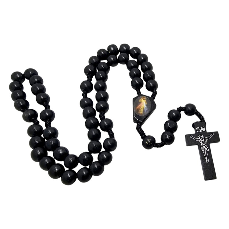 Centralnym punktem różańca jest drewniana łączka z wizerunkiem Jezusa Miłosiernego. To symboliczne przedstawienie Miłości i Miłosierdzia Bożego, które wzmacnia duchowe przesłanie różańca. Całość wieńczy pokaźny drewniany krzyż o wymiarach 42x24 mm, który harmonijnie dopełnia kompozycję i podkreśla sakralny charakter dewocjonalium.
