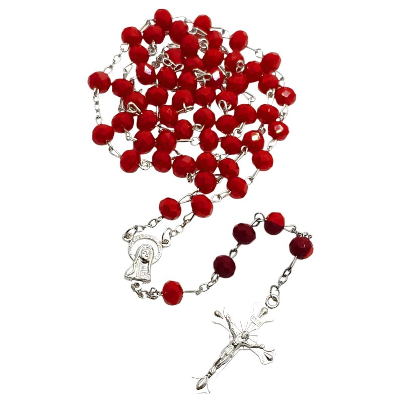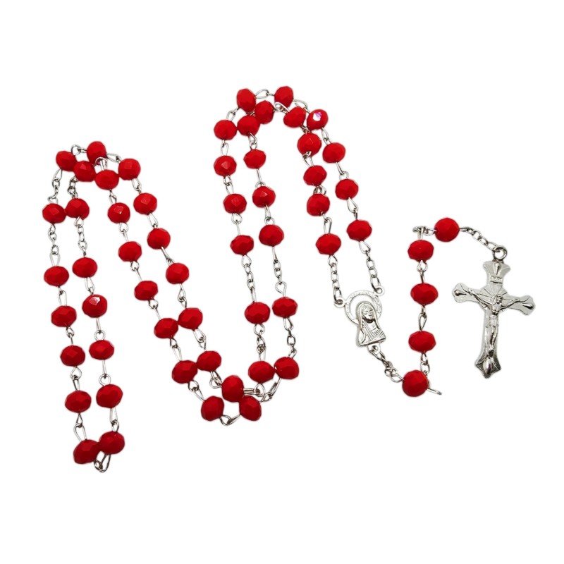 Odkryj głębię wiary w otoczeniu subtelnego blasku z naszym eleganckim różańcem, wykonanym z czerwonych koralików pięknie imitujących kryształki. Ten niezwykły różaniec to idealny towarzysz codziennej modlitwy i wyraz osobistej duchowości.