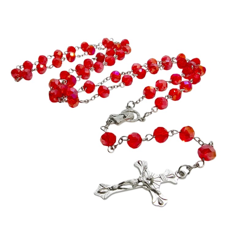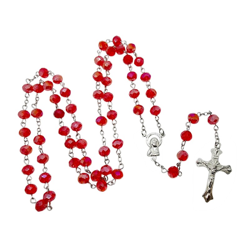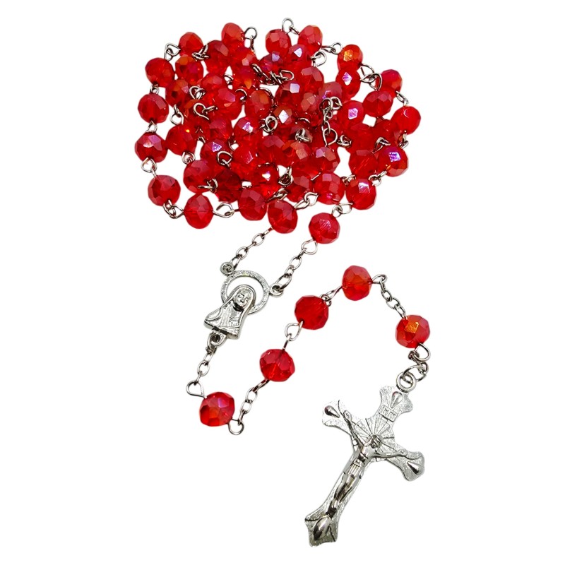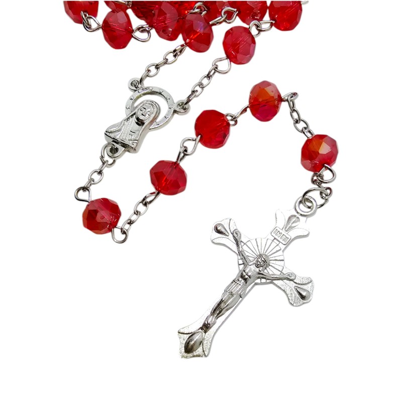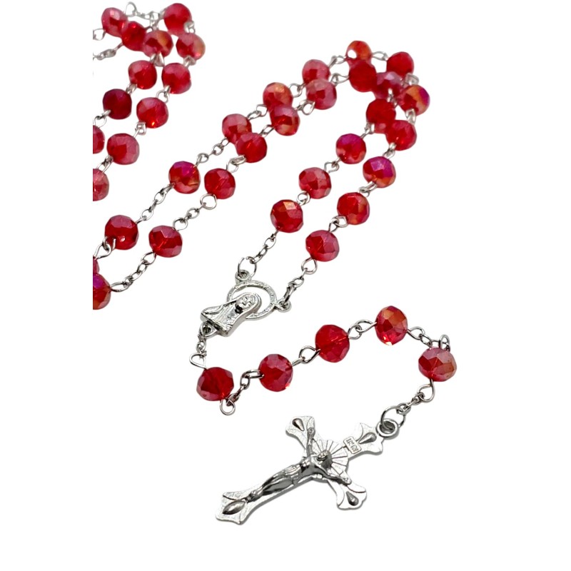 Odkryj duchowe piękno i hipnotyzujący blask z naszym eleganckim różańcem ze szlifowanego szkła w kolorze czerwonym. Koraliki tego różańca, przypominające kryształki, pięknie połyskują, tworząc wyjątkową oprawę dla Twojej modlitwy.
