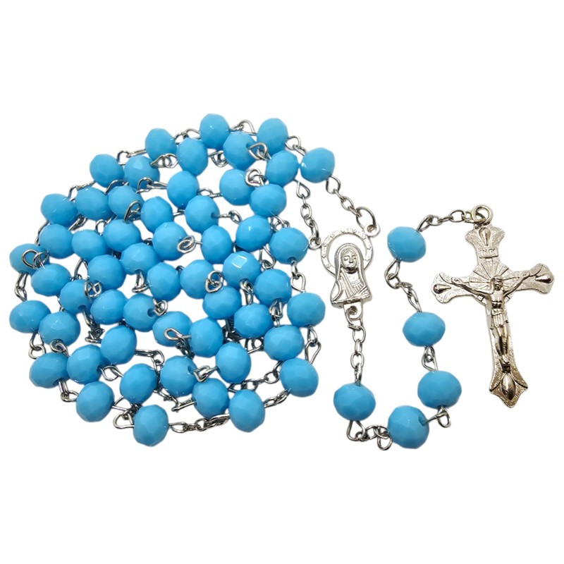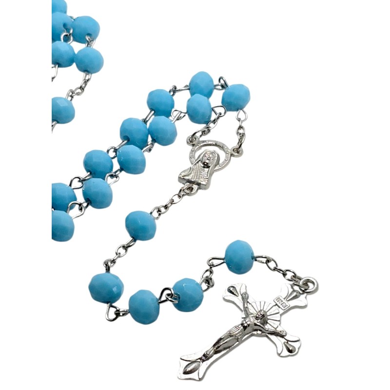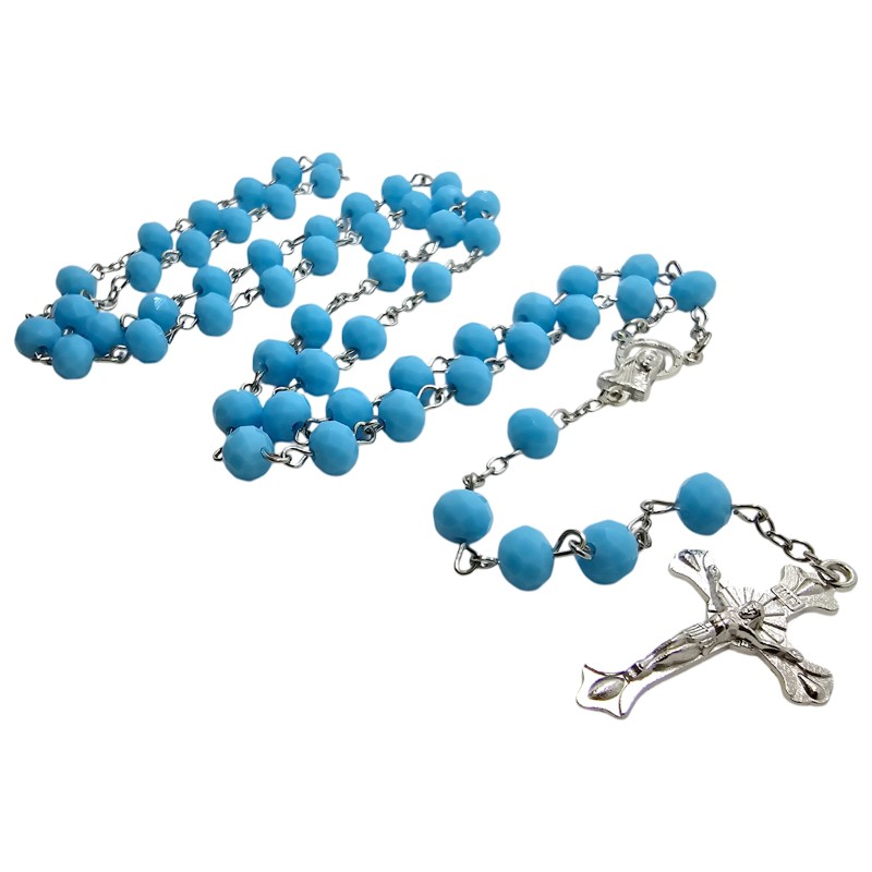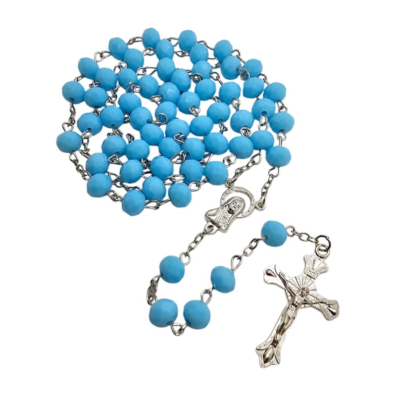 Odkryj duchowe piękno i hipnotyzujący blask z naszym eleganckim różańcem ze szlifowanego szkła w kolorze niebieskim. Koraliki tego różańca, przypominające kryształki, pięknie połyskują, tworząc wyjątkową oprawę dla Twojej modlitwy.