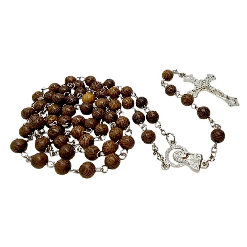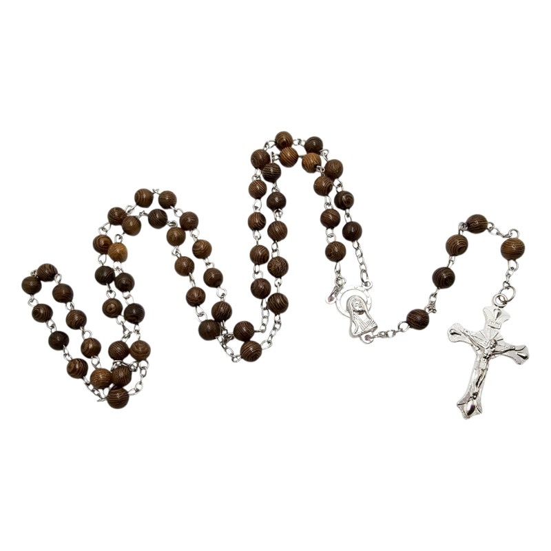 Różaniec ma długość 50 cm i obwód 70 cm, co sprawia, że jest wygodny do noszenia na szyi lub trzymania w dłoni. Został wykonany z plastikowych kuleczek o wielkości 7 mm w kolorze brązowym, ozdobionych wymalowanymi wzorkami drewnopodobnymi, co nadaje im unikalny i naturalny wygląd. Koraliki są nawleczone na solidny łańcuszek, co zwiększa jego wytrzymałość i elegancję.