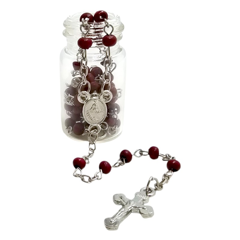 Całość wieńczy klasyczny krzyżyk o wymiarach 20x12 mm, a łącznikiem jest medalik z wizerunkiem Matki Bożej Niepokalanej, symbolizujący czystość i opiekę Maryi. Różaniec jest przechowywany w eleganckim słoiczku, który chroni jego aromat i pozwala na estetyczne przechowywanie.