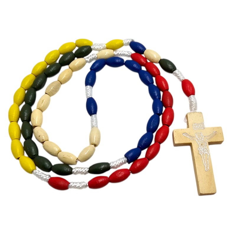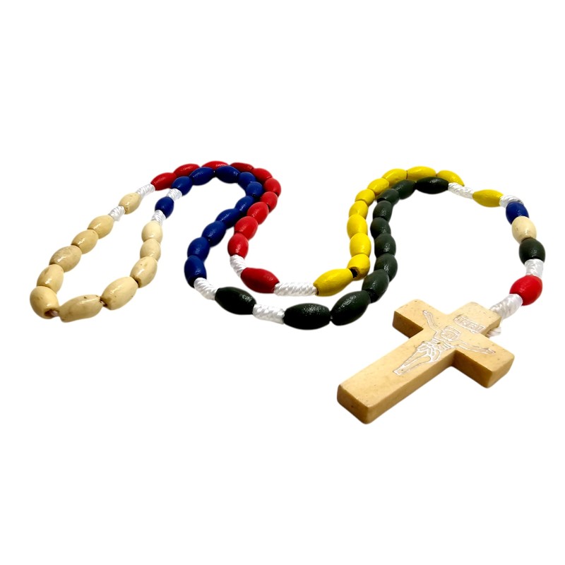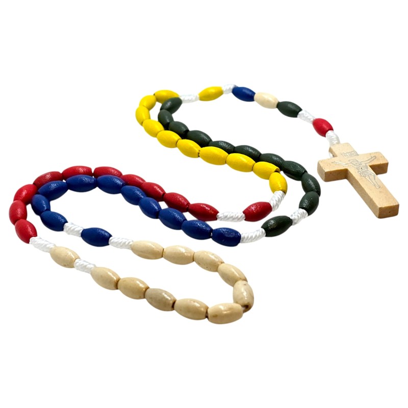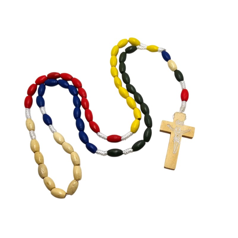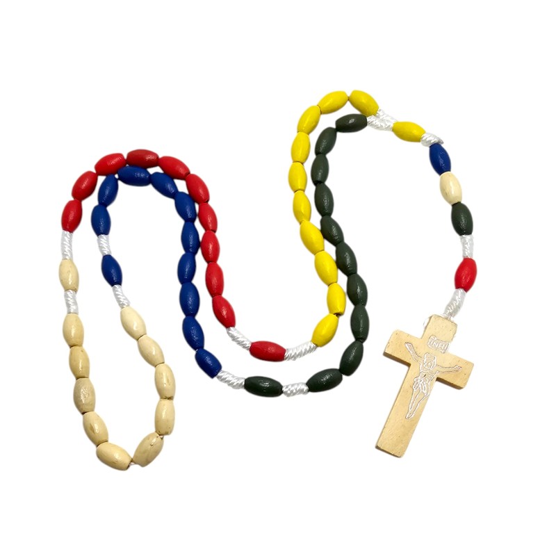 Centralnym elementem jest drewniany krzyż o wymiarach 42x24 mm, którego prostota podkreśla głębokie znaczenie poświęcenia i wiary. Misyjny charakter różańca często manifestuje się poprzez obecność koralików w pięciu kolorach, symbolizujących kontynenty i powszechność Kościoła, choć ten opis skupia się na naturalnym drewnie.