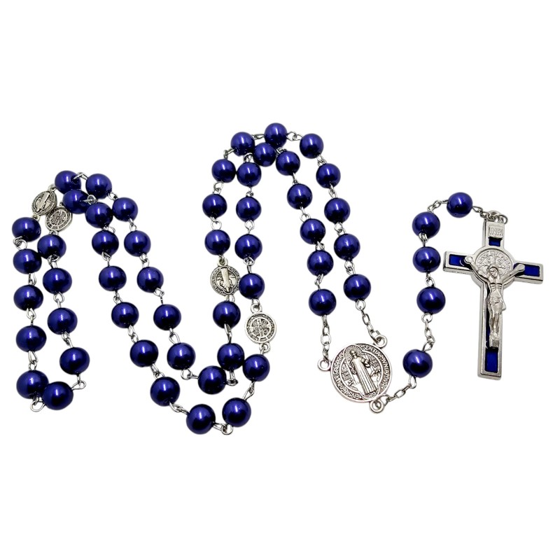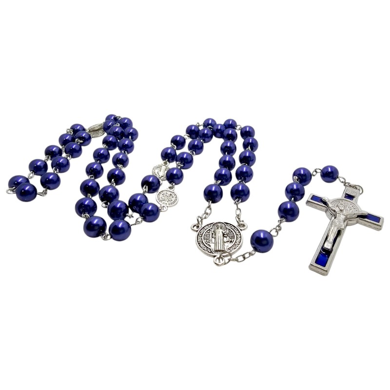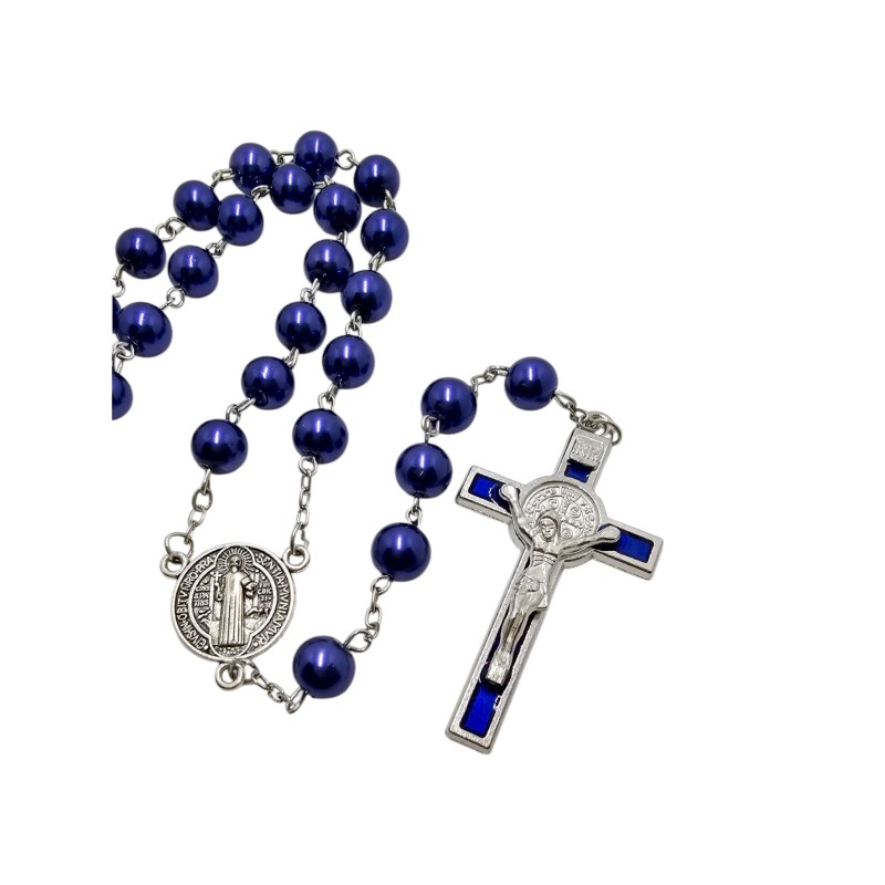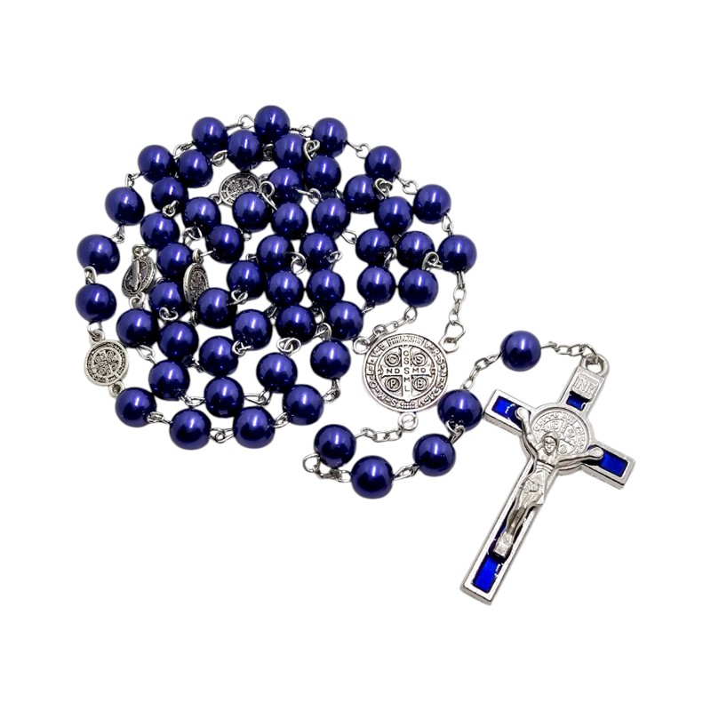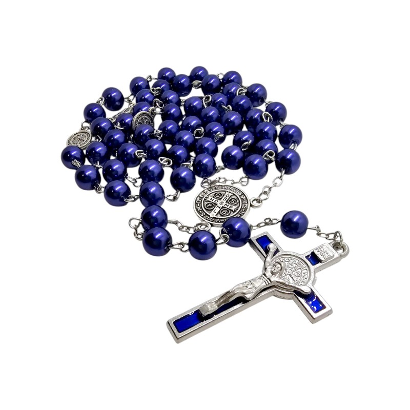 Odkryj piękno modlitwy i moc ochronną z naszym niebiesko-perłowym różańcem. Wykonany z eleganckich, szklanych koralików o perłowym połysku w odcieniach czerwieni, ten różaniec emanuje subtelną elegancją. Dziesiątki różańca oddzielone są metalowymi medalikami św. Benedykta, potężnym symbolem ochrony przed złem. Całość wieńczy wyrazisty krzyż św. Benedykta w kolorze niebieskim. Ten 53-centymetrowy różaniec jest idealny do codziennej modlitwy i jako wyjątkowy prezent o głębokim znaczeniu.