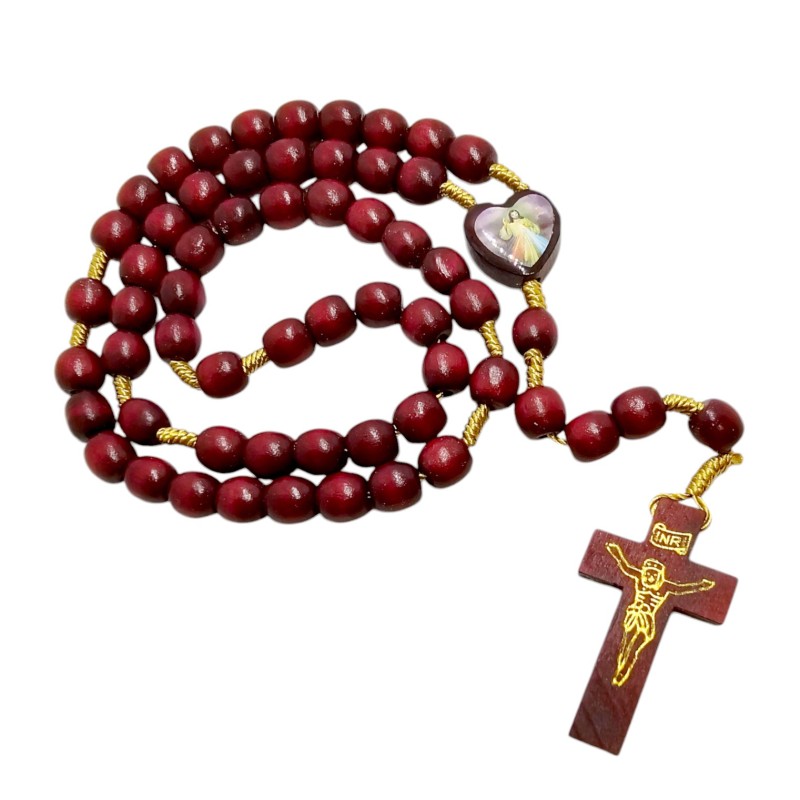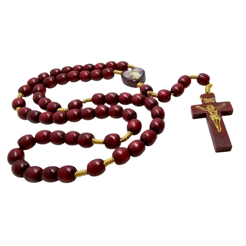 Bordowy Drewniany Różaniec - Serce Jezusa Miłosiernego.