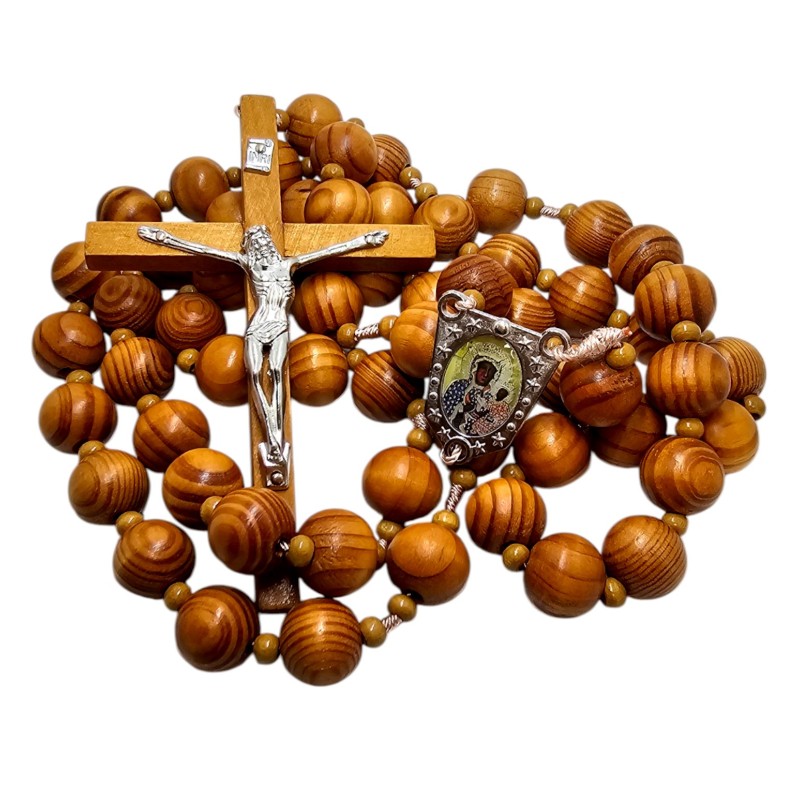 Centralnym elementem tego różańca jest pięknie wykonany łącznik z wizerunkiem Matki Boskiej Częstochowskiej. Ten mocny symbol wiary, Królowej Polski, będzie nieustannym przypomnieniem o Jej opiece i wstawiennictwie w trudnych chwilach. Całość wieńczy solidny, drewniany krzyż o imponujących wymiarach 14x9 cm, stanowiący mocny akcent i symbol odkupienia.