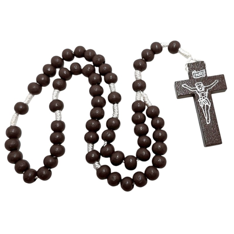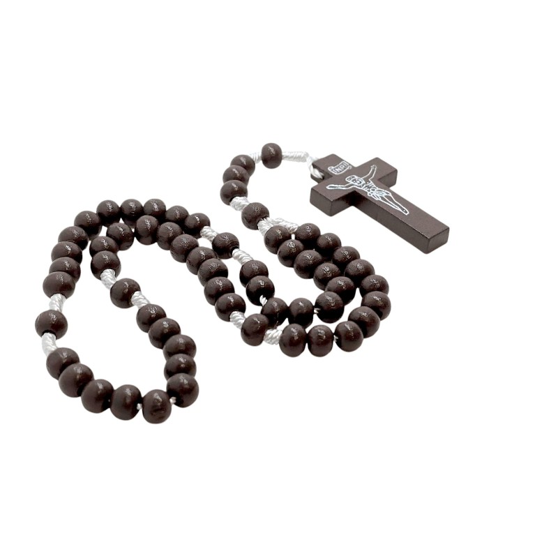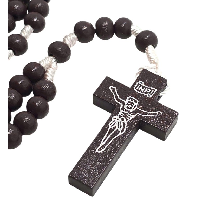 Klasyczny różaniec wykonany z naturalnego drewna, pomalowanego na głęboki, ciemnobrązowy kolor. Kontrastujący biały, trwały sznurek łączy koraliki o wygodnej wielkości 8 mm. Centralnym elementem różańca jest wyraźny, drewniany krzyż o wymiarach 42x25 mm. Długość całego różańca wynosi 28 cm. To eleganckie połączenie ciemnego drewna z jasnym sznurkiem czyni ten różaniec ponadczasowym przedmiotem modlitwy i wyrazem wiary.