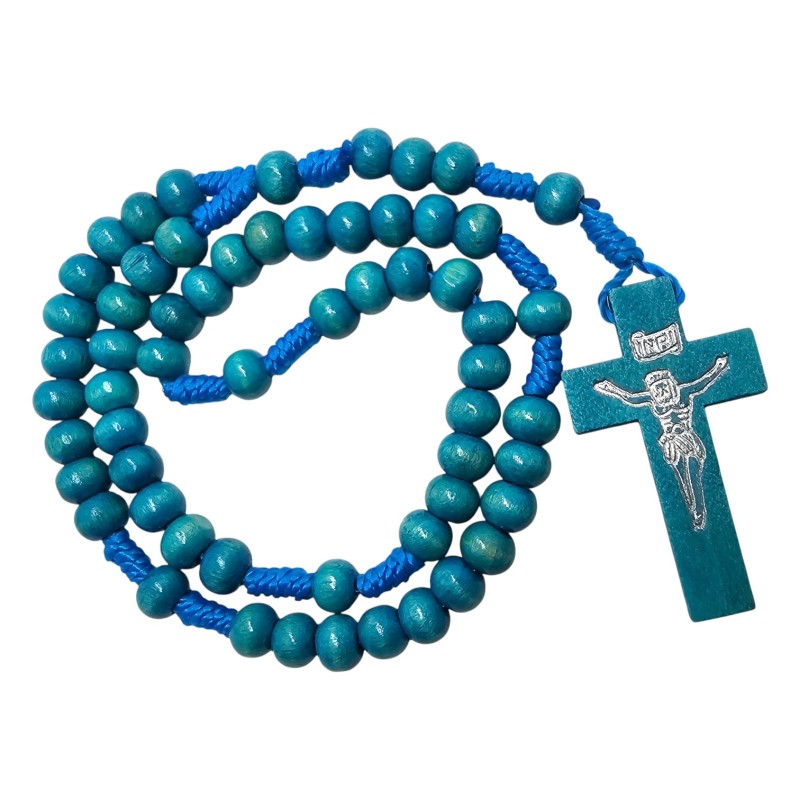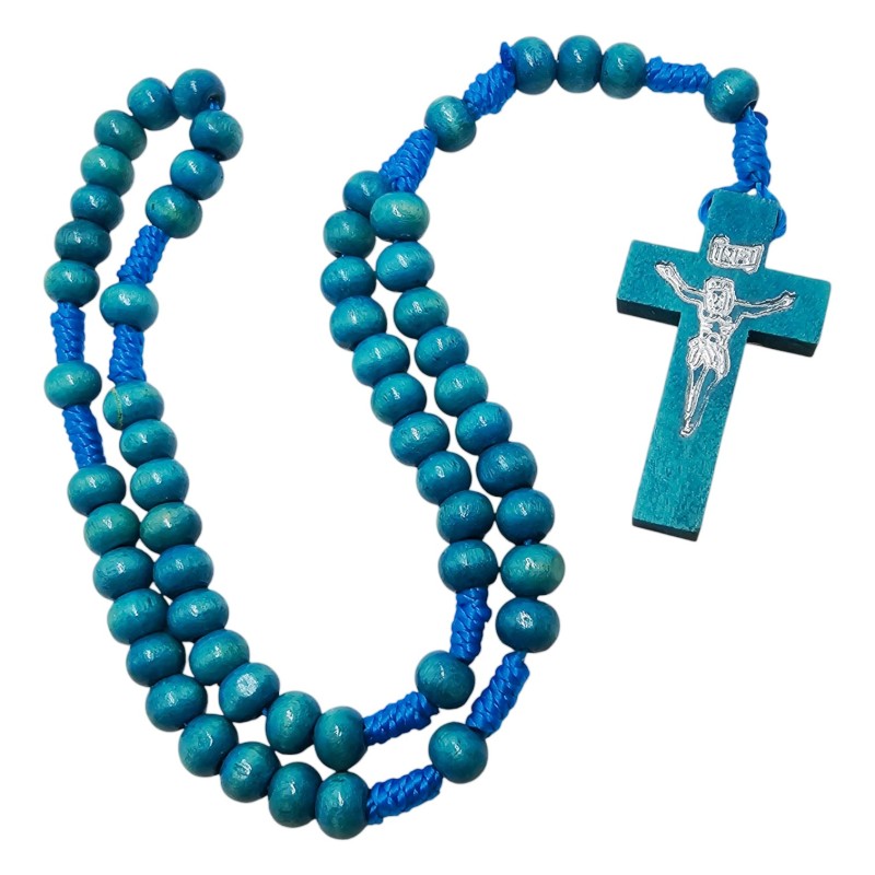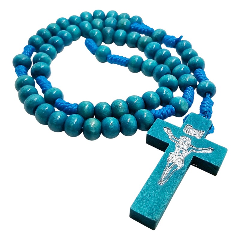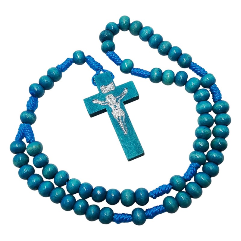 Różaniec wykonany z naturalnego drewna w pięknym, turkusowym kolorze. Jego długość wynosi około 30 cm (obwód 38 cm), a koraliki mają średnicę 7 mm, co sprawia, że jest poręczny i wygodny w modlitwie. Centralnym elementem różańca jest ozdobny, drewniany krzyż o wymiarach 42x24 mm, który dodaje mu elegancji. Koraliki połączone są trwałym sznurkiem. Ten kojący kolor i naturalny materiał czynią ten różaniec wyjątkowym przedmiotem wiary i modlitwy.