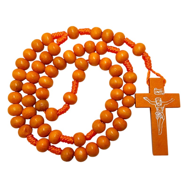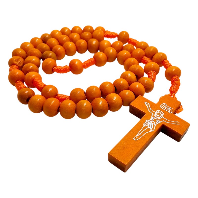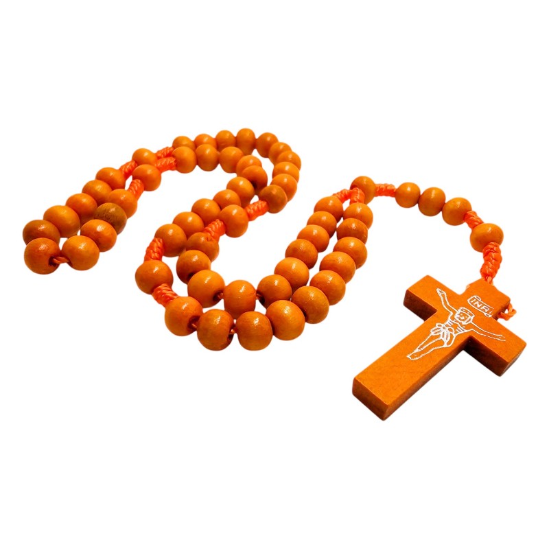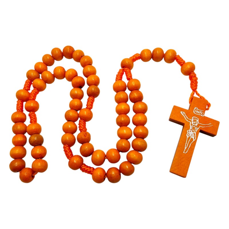 Wyrazisty różaniec wykonany z naturalnego drewna w ciepłym, pomarańczowym kolorze. Jego długość wynosi 32 cm, a koraliki mają średnicę 8 mm, co sprawia, że jest wygodny w modlitwie. Centralnym elementem różańca jest duży, drewniany krzyż o wymiarach 42x24 mm, który nadaje mu charakterystycznego wyglądu. Koraliki połączone są trwałym sznurkiem. Ten radosny kolor i naturalny materiał czynią ten różaniec wyjątkowym przedmiotem wiary i modlitwy.