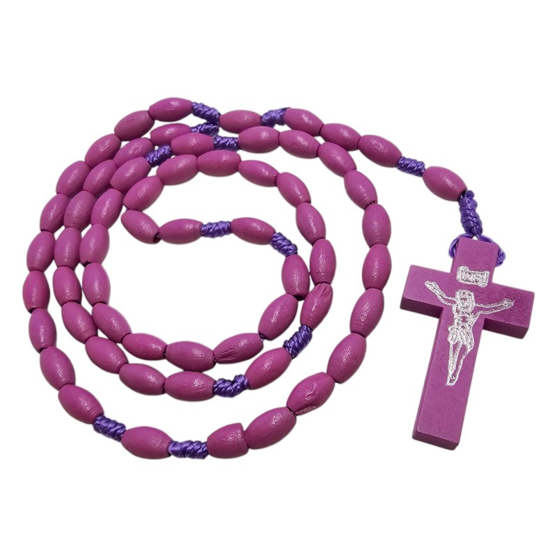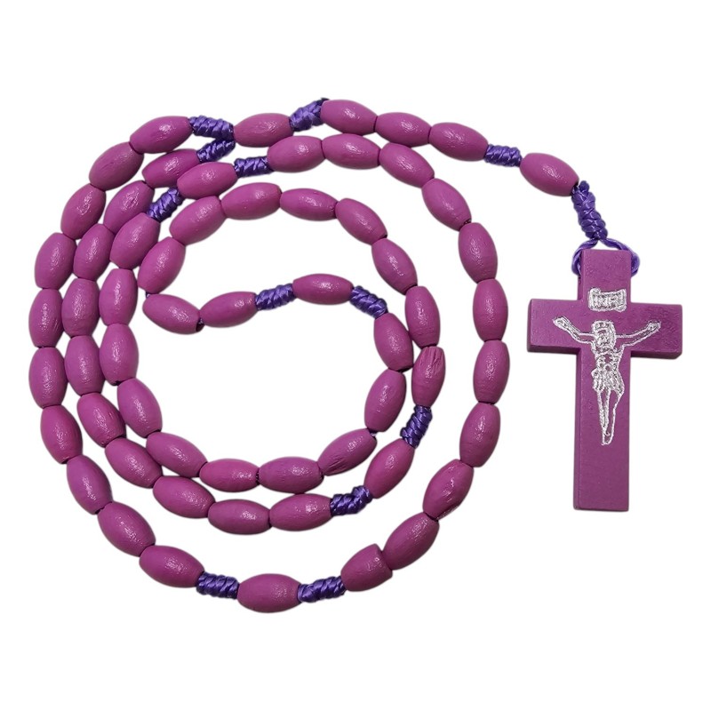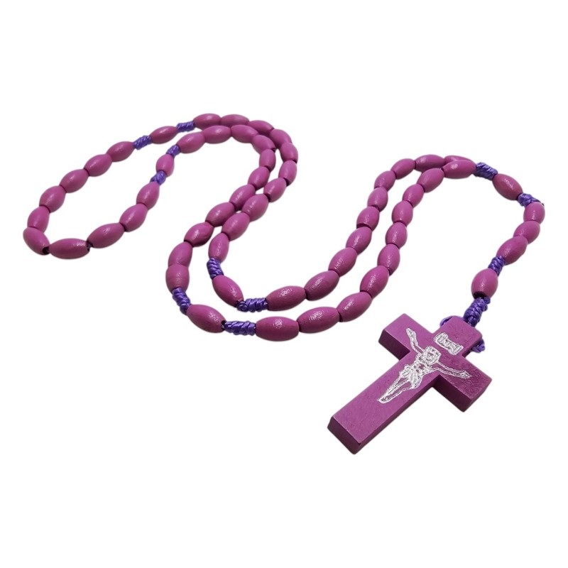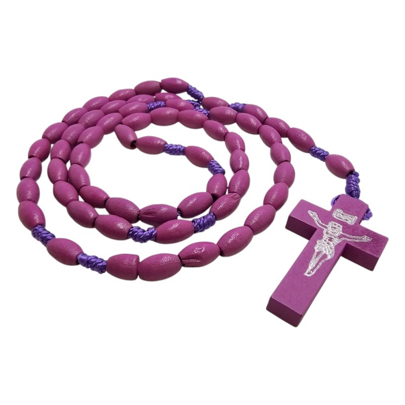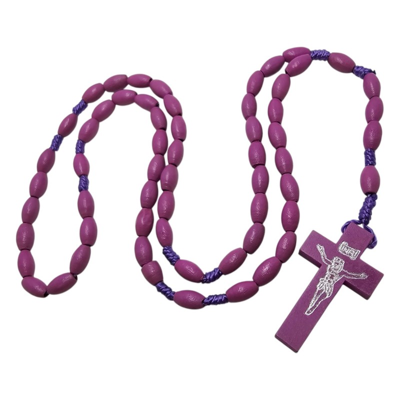 Subtelny i elegancki różaniec o długości około 44 cm, wykonany z owalnych, drewnianych koralików w głębokim fioletowym kolorze o wymiarach 10x6 mm. Różaniec połączony jest trwałym, fioletowym sznurkiem. Centralnym elementem jest drewniany krzyż o wymiarach 42x24 mm, na którym odciśnięta jest pasyjka w kolorze srebrnym, dodająca mu wyrafinowanego charakteru. Ten pięknie wykonany różaniec jest idealnym towarzyszem modlitwy i wyrazem wiary.
