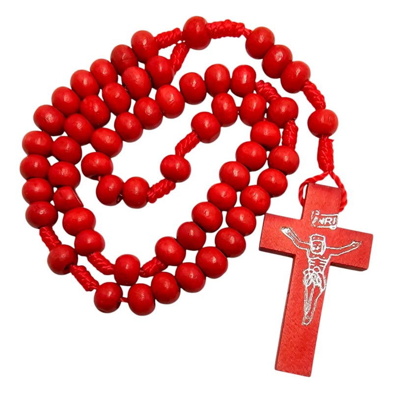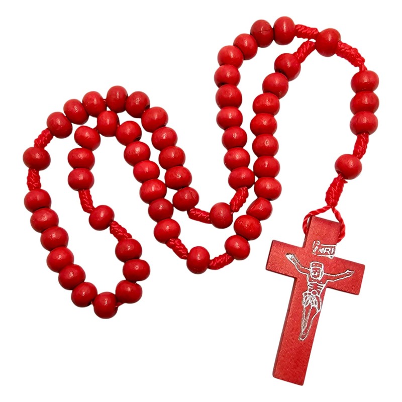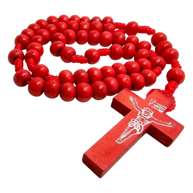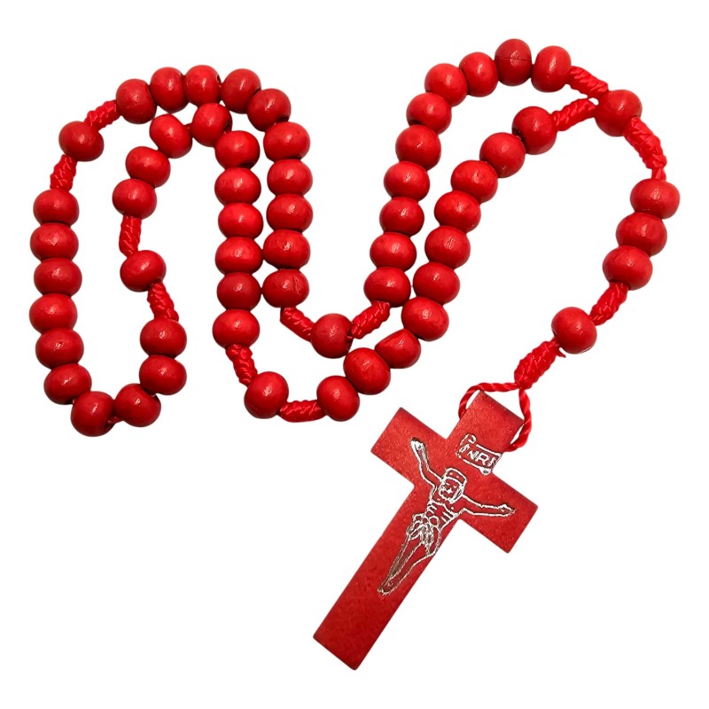 Wyrazisty różaniec wykonany z naturalnego drewna w intensywnym czerwonym kolorze. Jego długość wynosi 28 cm, a koraliki mają średnicę 7 mm, co sprawia, że jest poręczny i wygodny do modlitwy. Centralnym elementem różańca jest prosty, drewniany krzyż o wymiarach 42x24 mm, który nadaje mu charakterystycznego wyglądu. Koraliki połączone są trwałym, kolorowym sznurkiem. Ten pełen pasji kolor i naturalny materiał czynią ten różaniec wyjątkowym przedmiotem wiary i modlitwy.
