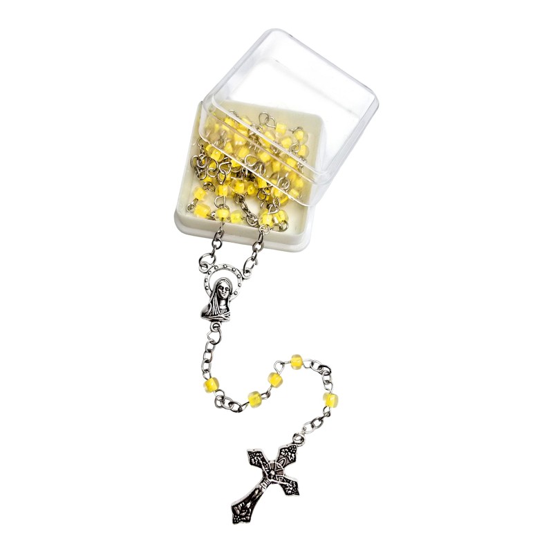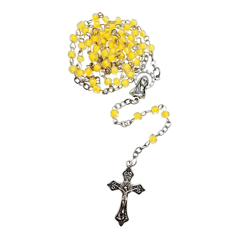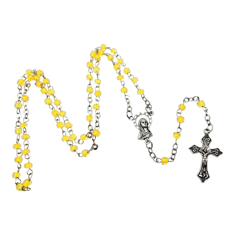 Koraliki różańca wykonane są z przeźroczystego plastiku, w którego środek ma żywy, żółty kolor. Takie połączenie nadaje im wyjątkowej elegancji i atrakcyjnego efektu wizualnego, przywodząc na myśl światło i radość. Koraliki mają około 4 mm wielkości.