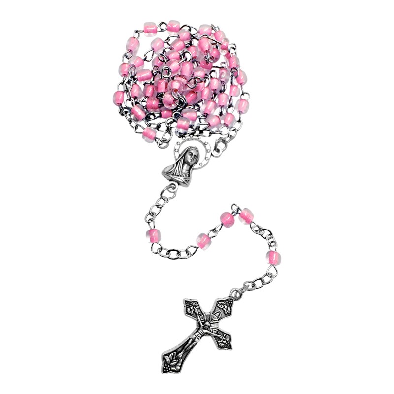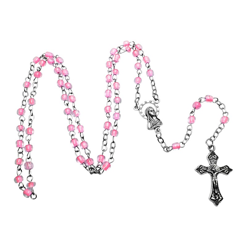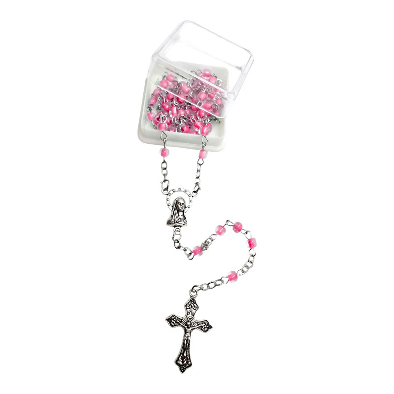 Koraliki różańca wykonane są z przeźroczystego plastiku, w którego środek ma subtelny, jasnoróżowy kolor. Takie połączenie nadaje im wyjątkowej elegancji i atrakcyjnego efektu wizualnego, idealnego na prezent dla dziewcząt. Koraliki mają około 4 mm wielkości.