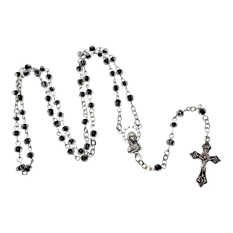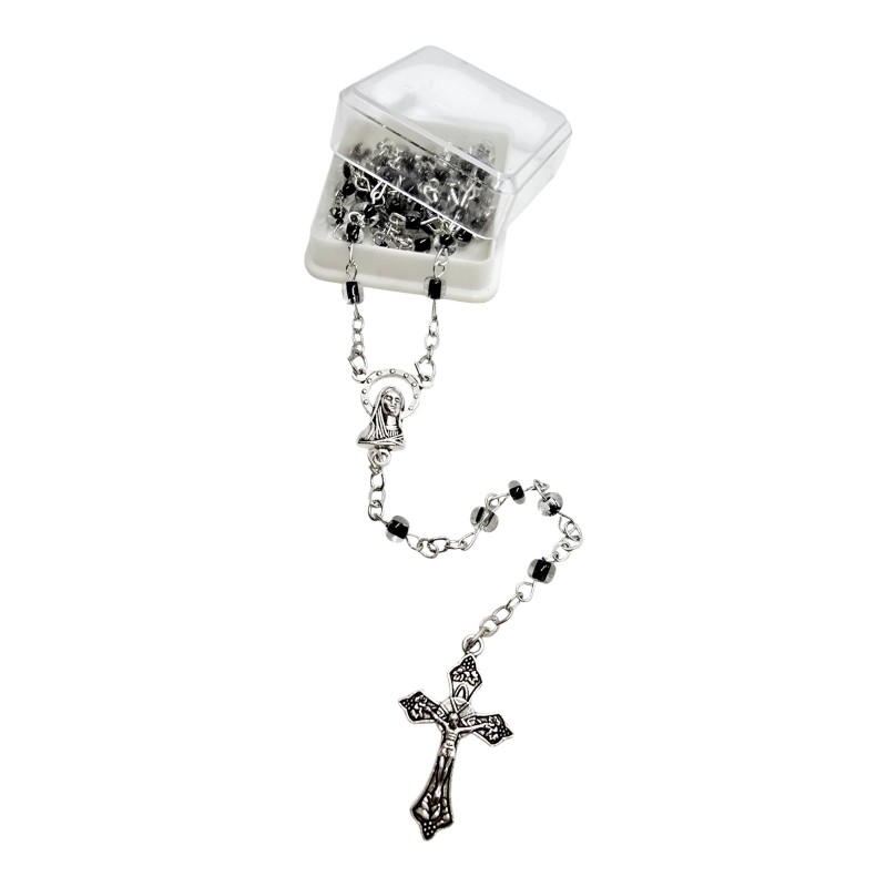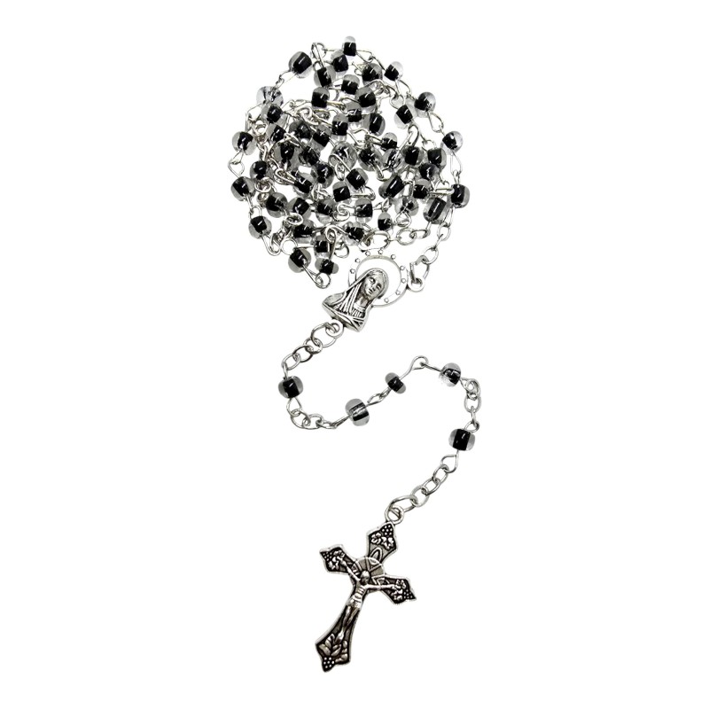 Koraliki różańca wykonane są z przeźroczystego plastiku, w którego środek ma głęboki, czarny kolor. Takie połączenie nadaje im wyjątkowej elegancji i atrakcyjnego efektu wizualnego. Koraliki mają około 4 mm wielkości.