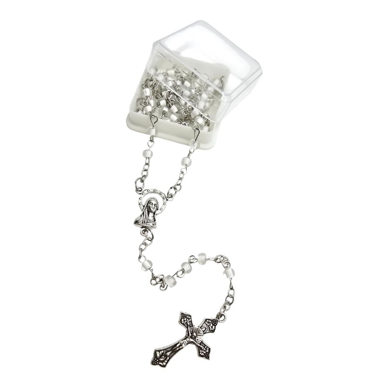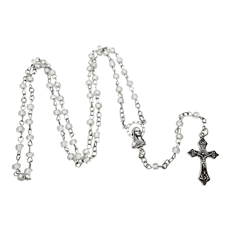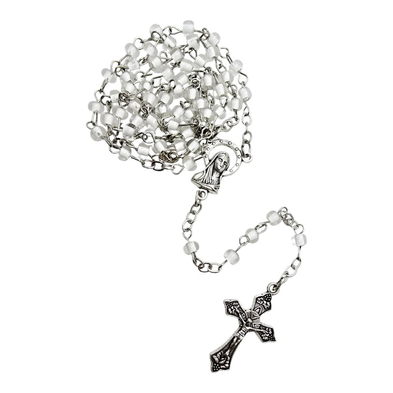 Koraliki różańca wykonane są z przeźroczystego plastiku, w którego środek ma czysty, biały kolor. Takie połączenie nadaje im wyjątkowej elegancji i subtelnego efektu "kryształowego". Koraliki mają około 4 mm wielkości.