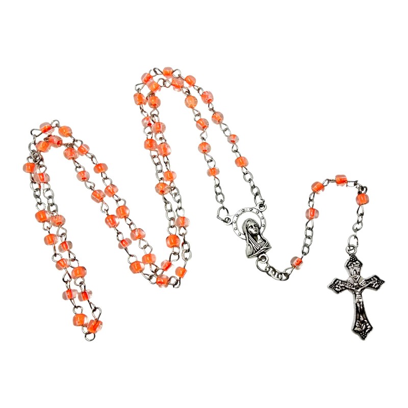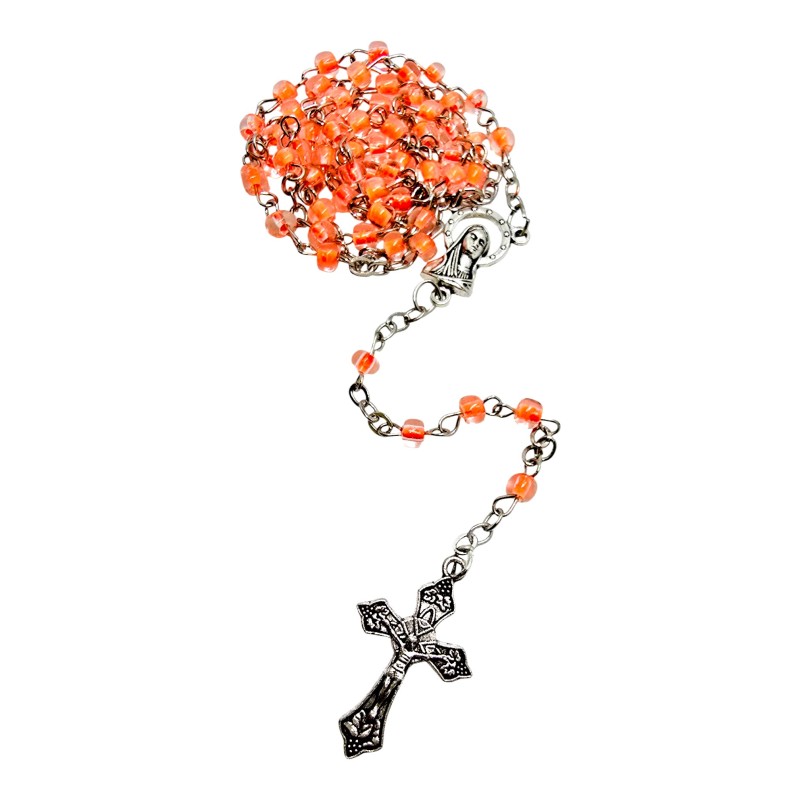 Koraliki różańca wykonane są z przeźroczystego plastiku, w którego środek ma jasny, pomarańczowy kolor. Takie połączenie nadaje im wyjątkowej elegancji i atrakcyjnego efektu wizualnego, przypominającego bursztyn lub ciepły zachód słońca. Koraliki mają około 4 mm wielkości.