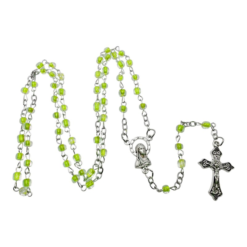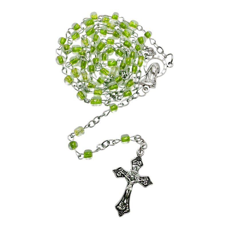 Koraliki różańca wykonane są z przeźroczystego plastiku, w którego środek ma żywy, zielony kolor. Takie połączenie nadaje im wyjątkowej elegancji i atrakcyjnego efektu wizualnego. Koraliki mają około 4 mm wielkości.