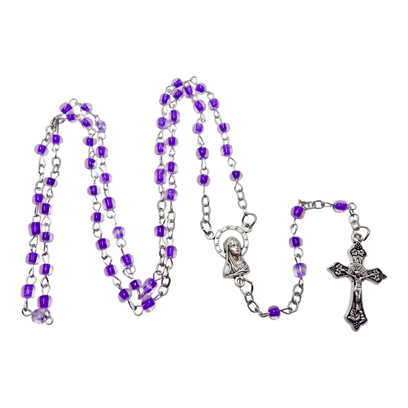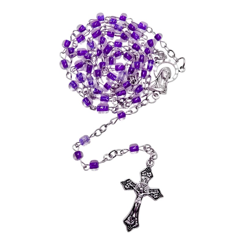 Koraliki różańca wykonane są z przeźroczystego plastiku, w którego środek ma głęboki, fioletowy kolor. Takie połączenie nadaje im wyjątkowej elegancji i atrakcyjnego efektu wizualnego, nawiązującego do barwy szat liturgicznych i królewskiej godności. Koraliki mają około 4 mm wielkości.