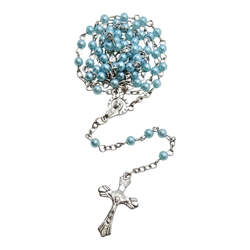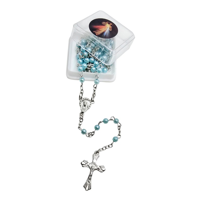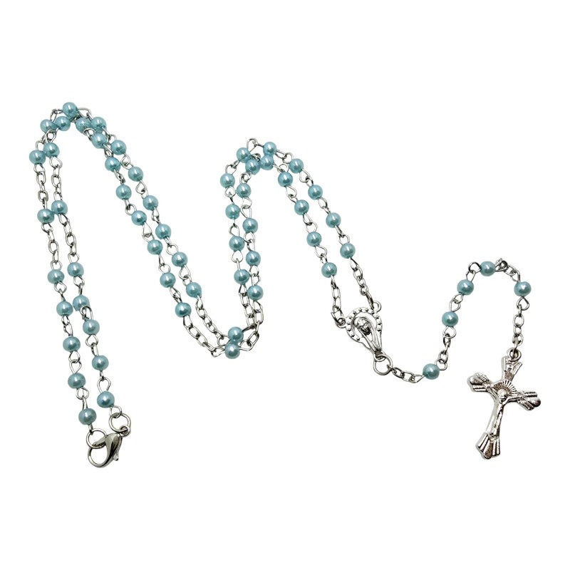 Elegancki i delikatny różaniec zapinany, idealny do noszenia na szyi jako łańcuszek lub np. do zawieszenia w aucie. Różaniec wykonany jest z malutkich, plastikowych kuleczek o średnicy 4 mm, które mienią się pięknym błękitnym, perłowym kolorem. Koraliki są nawleczone na wytrzymały łańcuszek i całość jest zapinana. Różaniec jest pakowany w estetyczne plastikowe pudełeczko (38x38 mm), dzięki czemu idealnie nadaje się na prezent.