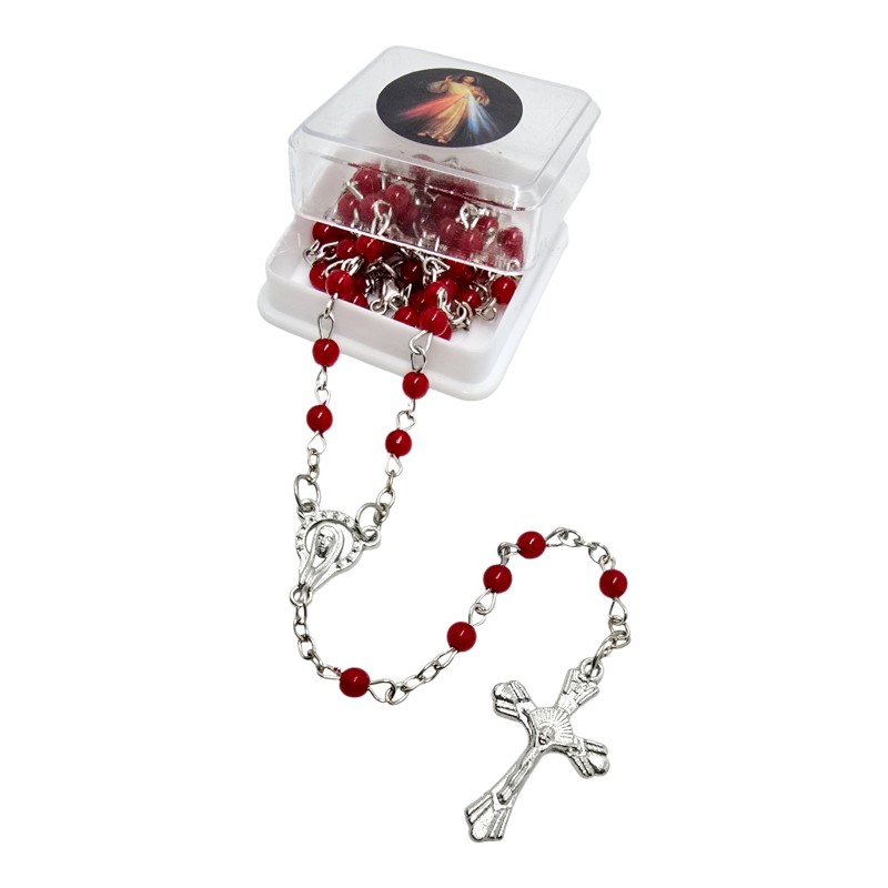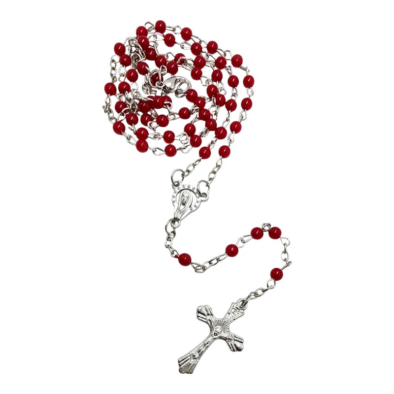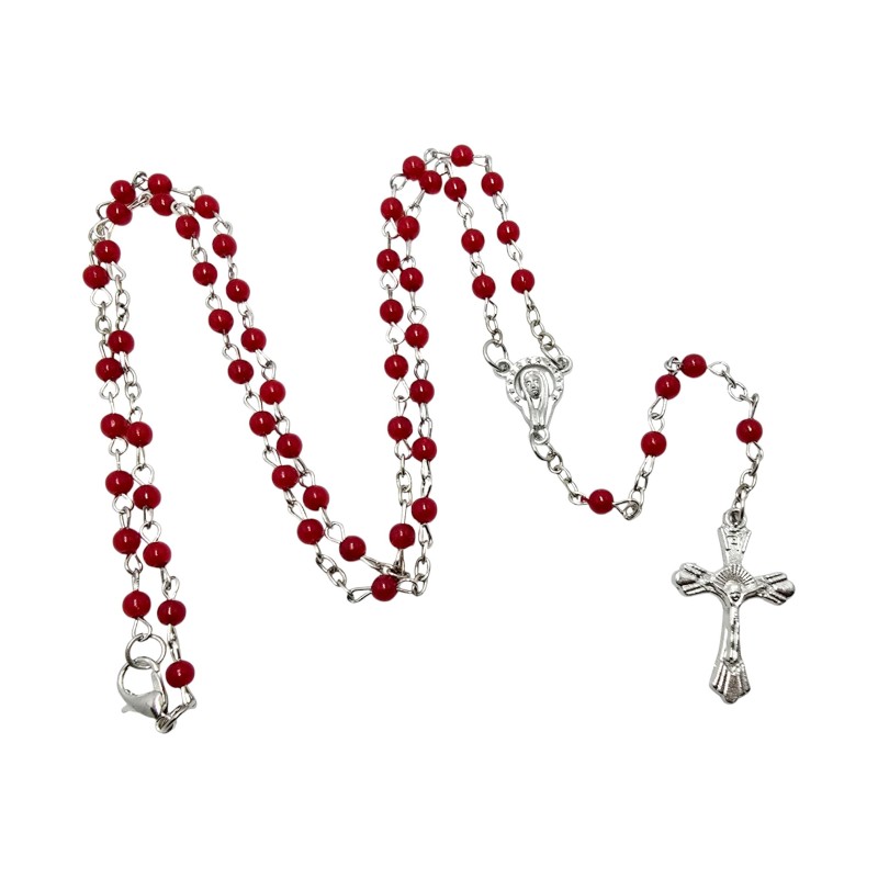 Elegancki i delikatny różaniec zapinany, idealny do noszenia na szyi jako łańcuszek lub do zawieszenia np. w aucie. Różaniec wykonany jest z malutkich, plastikowych kuleczek o średnicy 4 mm, które mienią się pięknym, czerwonym kolorem. Koraliki są nawleczone na wytrzymały łańcuszek i całość jest zapinana. Różaniec jest pakowany w estetyczne plastikowe pudełeczko (38x38 mm), dzięki czemu idealnie nadaje się na prezent.