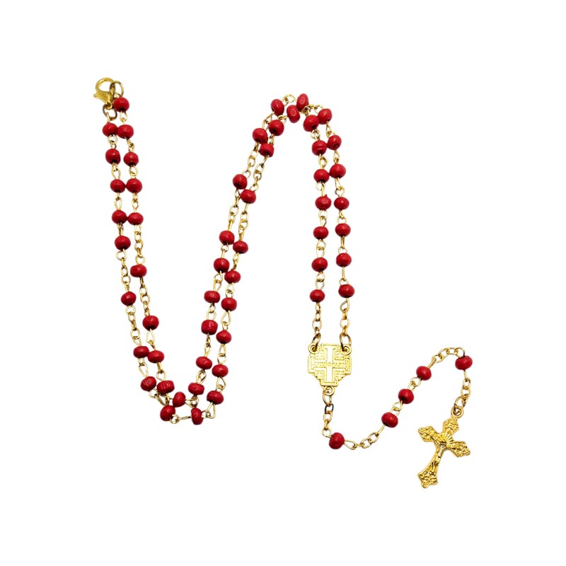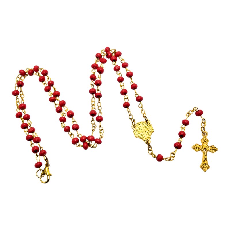 Wyjątkowy i uroczy różaniec zapachowy w niecodziennej, eleganckiej oprawie. Różaniec został wykonany z delikatnych, drewnianych koralików w intensywnym czerwonym kolorze, które zostały nasycone łagodnym zapachem. Koraliki są nawleczone na lśniący, złoty łańcuszek, co nadaje całości szlachetnego wyglądu. Różaniec jest idealnie skomponowany z małym, szklanym słoiczkiem ze złotą nakrętką, co nadaje mu wyjątkowego i ekskluzywnego charakteru.