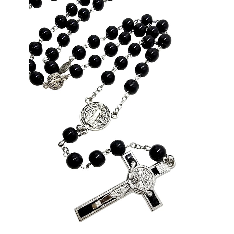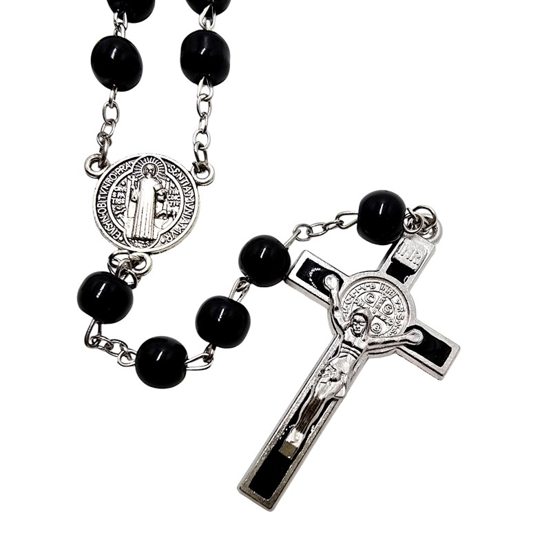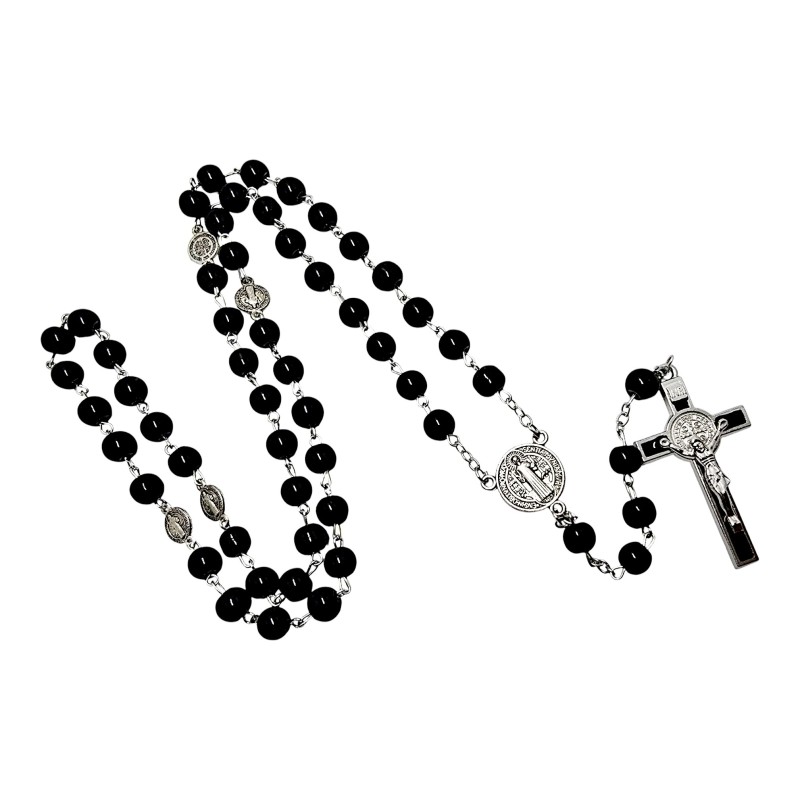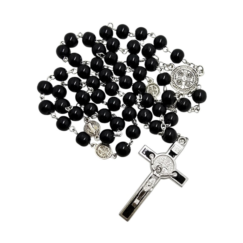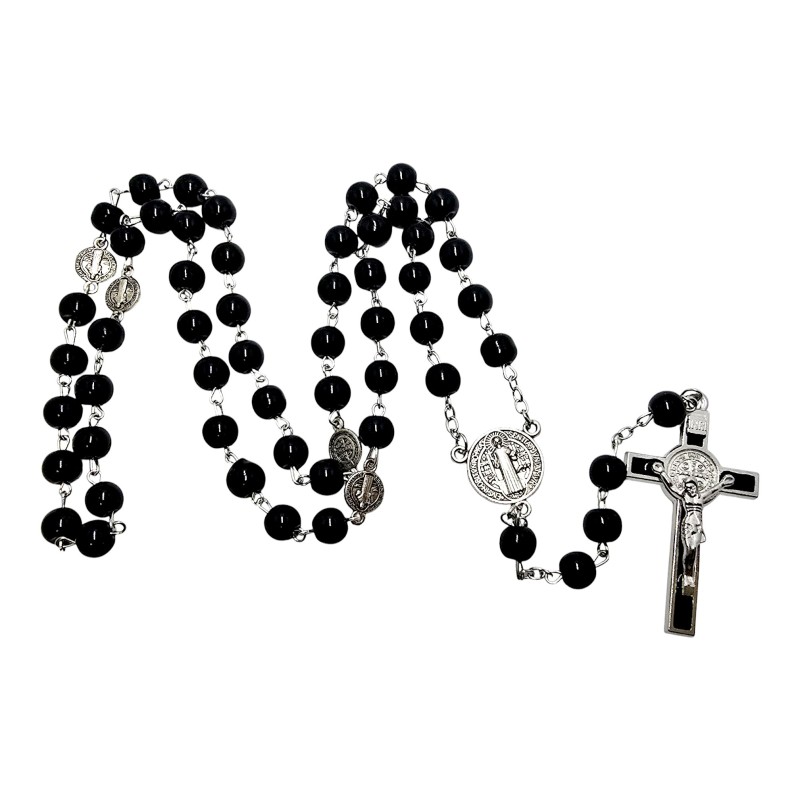 Wyjątkowo elegancki i silnie symboliczny różaniec szklany, wykonany w klasycznym, głębokim czarnym kolorze. Koraliki o średnicy 8 mm są idealnie gładkie i połyskujące, co nadaje różańcowi szlachetnego wyglądu. Jest to idealny przedmiot dla osób ceniących estetykę i ochronną moc Świętego Benedykta.