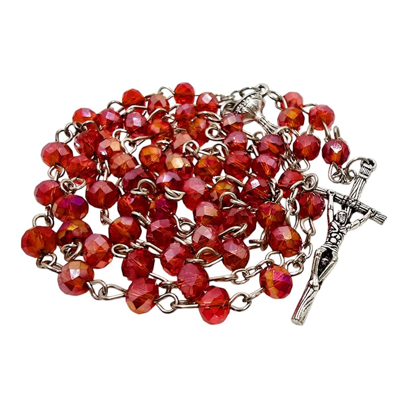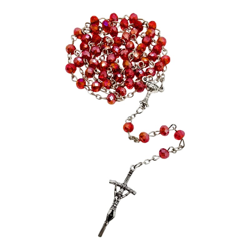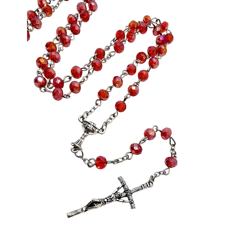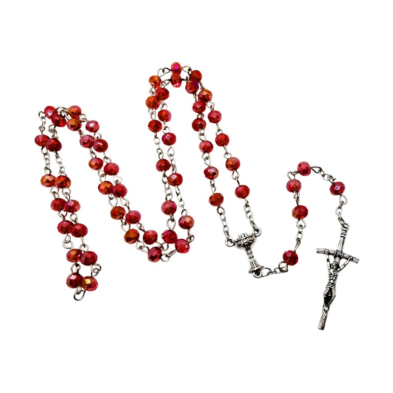Ten elegancki różaniec na łańcuszku to idealna pamiątka Sakramentu, łącząca piękny wygląd z praktycznym opakowaniem. Różaniec wykonano z czerwonych, połyskujących kryształków z plastiku, które doskonale imitują szklane koraliki, mieniąc się subtelnym blaskiem. Jest osadzony na trwałym łańcuszku i dostarczany w plastikowym pudełeczku, dzięki czemu jest gotowy do wręczenia.