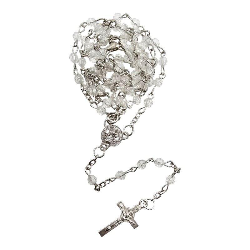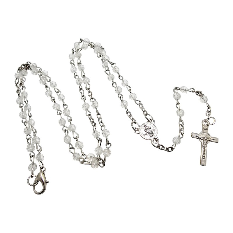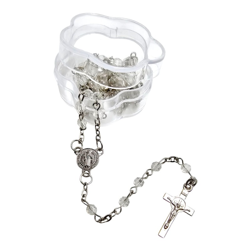 Wyjątkowy i delikatny różaniec zapinany, idealny dla osób poszukujących pięknej biżuterii religijnej o silnym znaczeniu symbolicznym. Różaniec został wykonany na subtelnym łańcuszku i składa się z mieniących się, przeźroczystych plastikowych kryształków, które pięknie imitują szkło. Jest to doskonała pamiątka i prezent, sprzedawany w uroczym, dekoracyjnym pudełeczku w kształcie kwiatuszka.